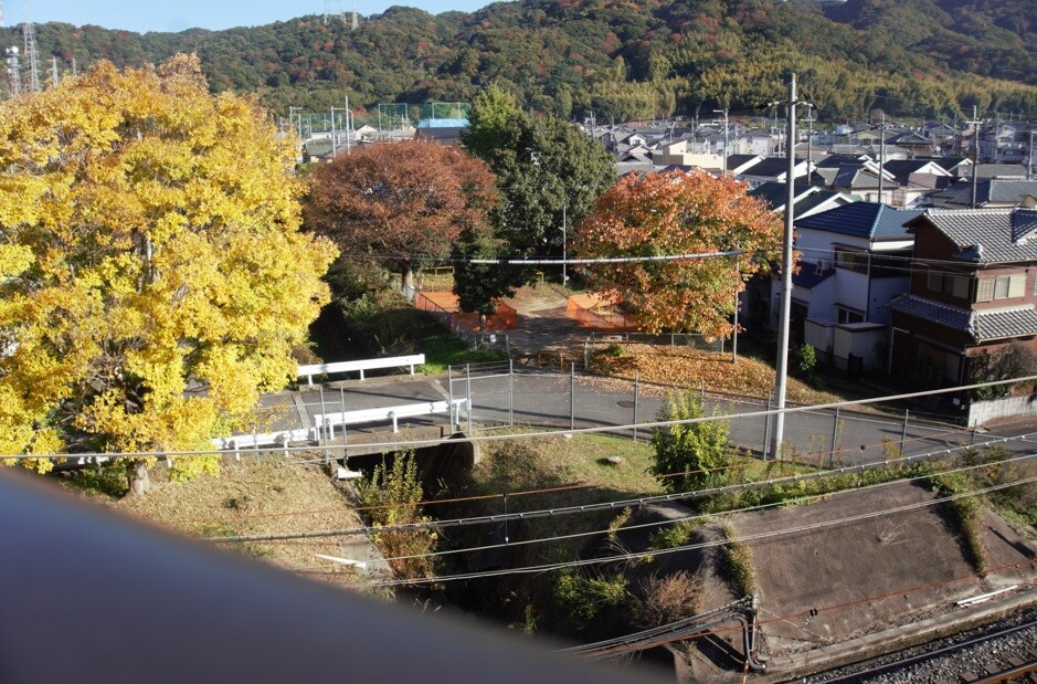 学研都市線(写真右下)を跨ぐ第二京阪道路の歩道から見ると、こんな感じ。
