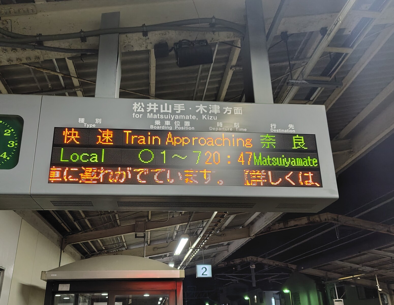 普段は木津、同志社前、松井山手などの地名が並ぶ電光掲示板に、見慣れない「奈良」が表示されているのが分かります。
