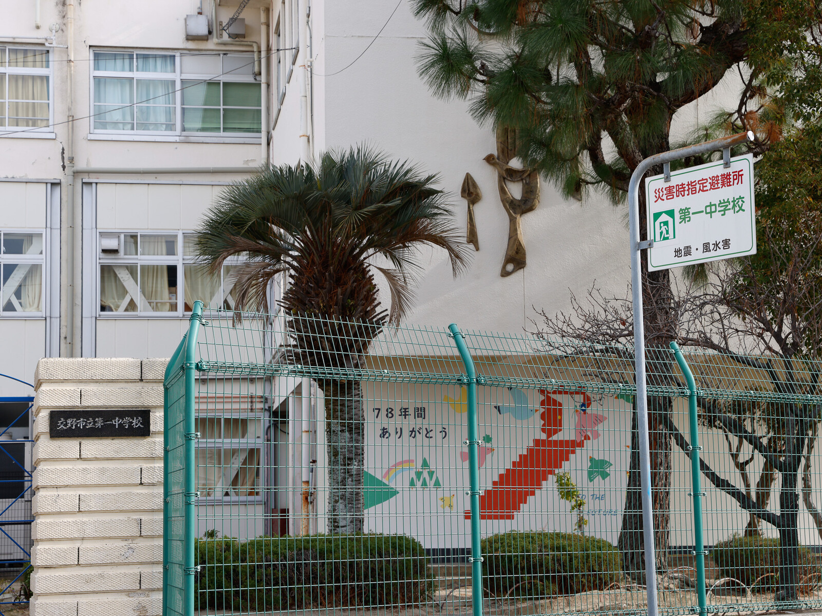 第一中学校の校舎にも感謝の言葉が書かれていた