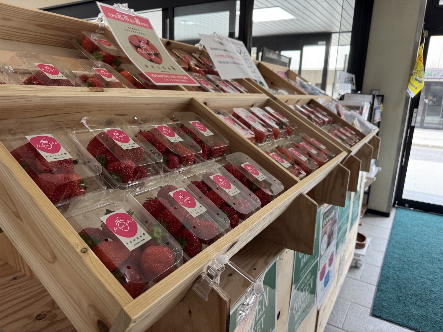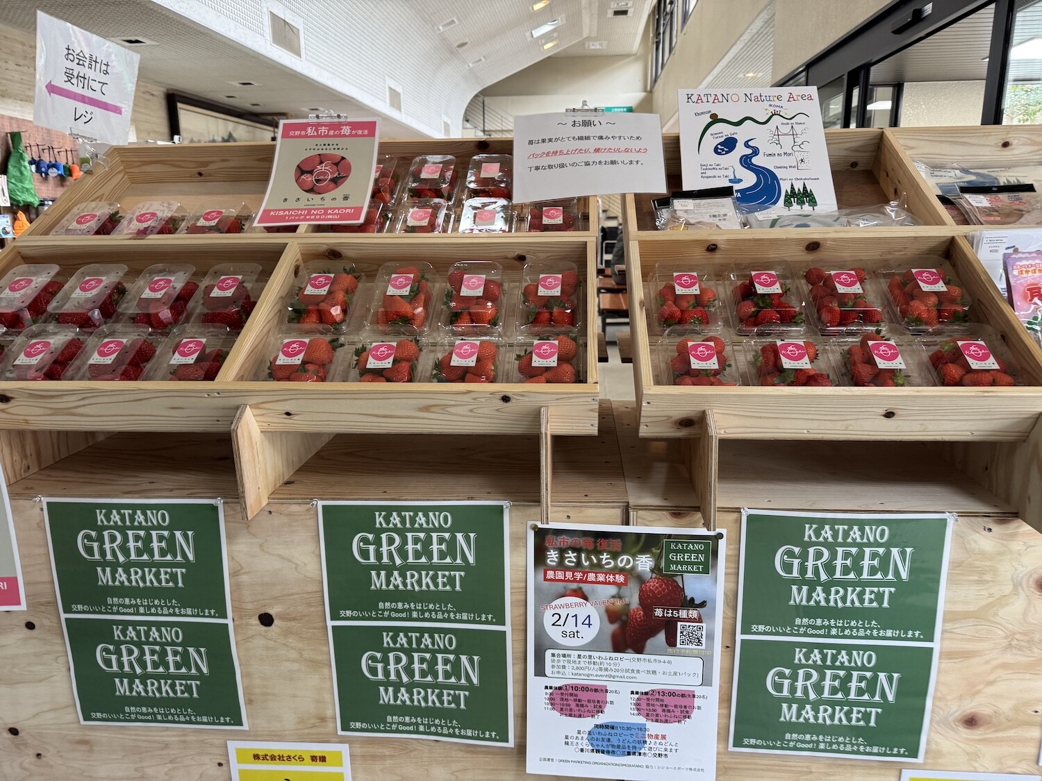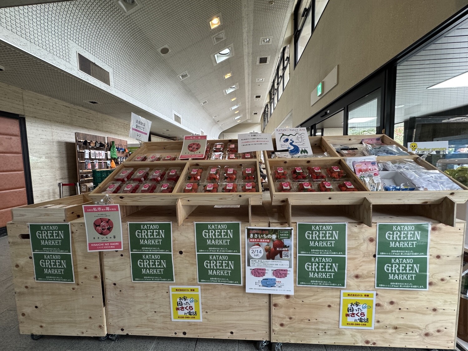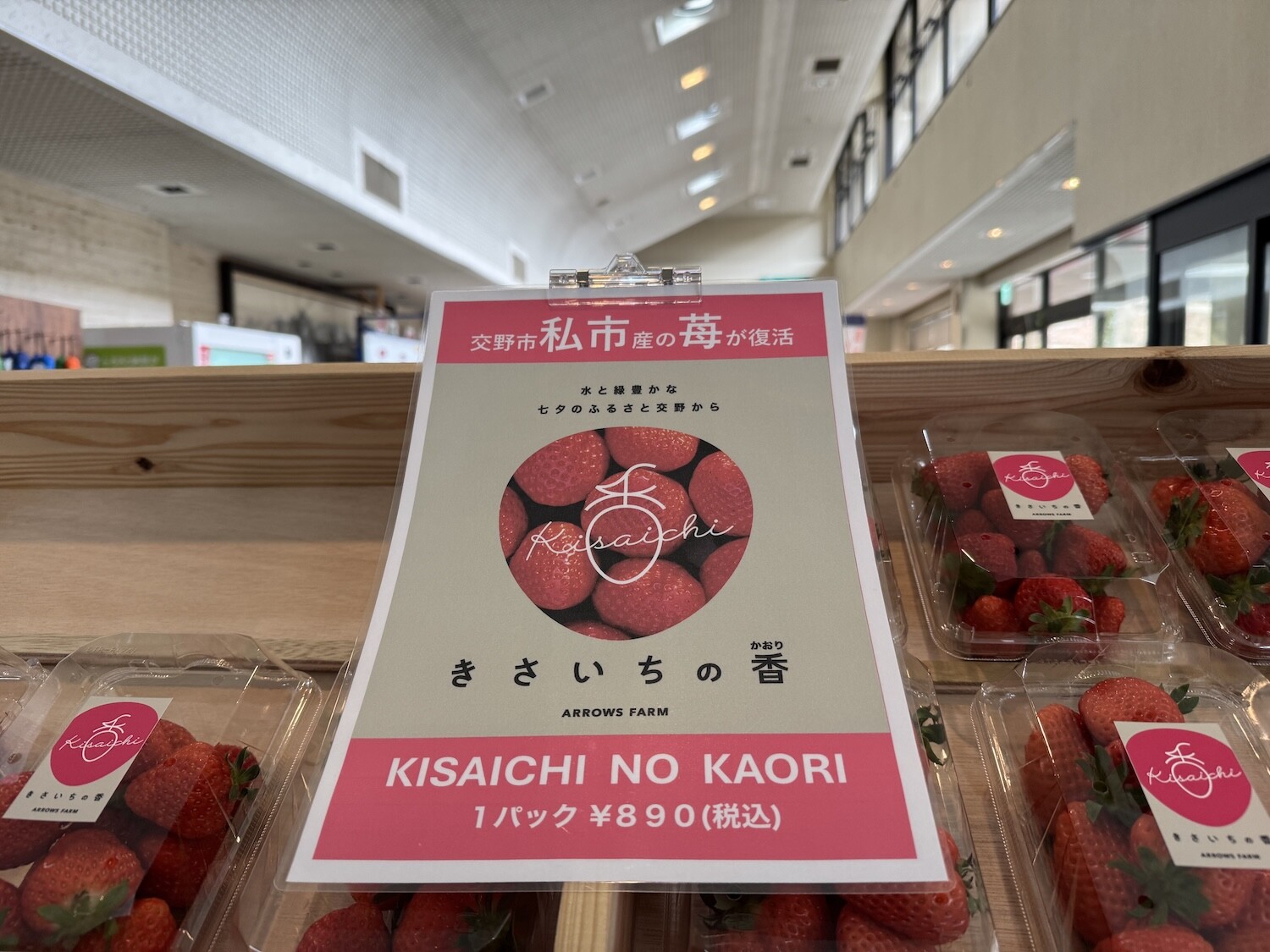 第一弾企画として12月20日から来年3月22日までアローズファームの私市産イチゴ(きさいちの香)をメインに地域の農産物、私市駅前のトレラン・アウトドアショップのソトアソのアウトドアグッズ、交野市星のまち観光協会のNature area KATANOグッズなどが販売されています。