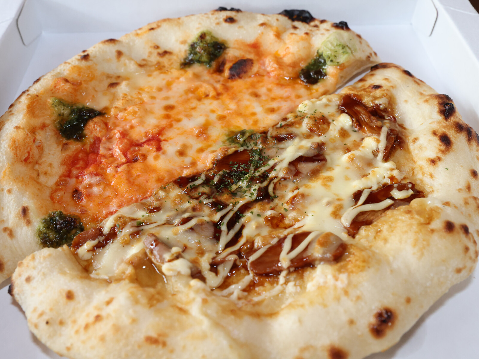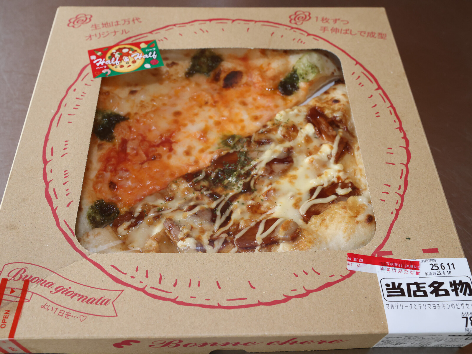 こちらは、2種類のピザが1枚分入っているバージョンですが、他にもマルゲリータやエビの入りバージョンもあって、選ぶのも楽しいです。