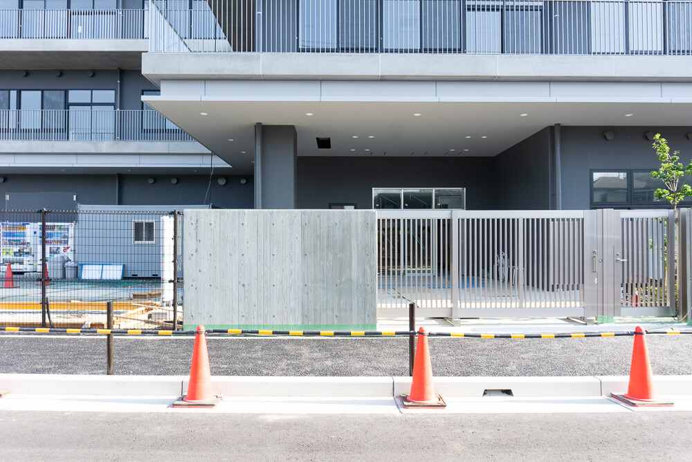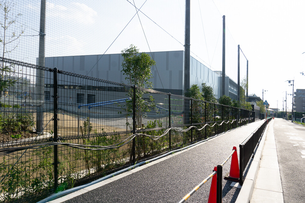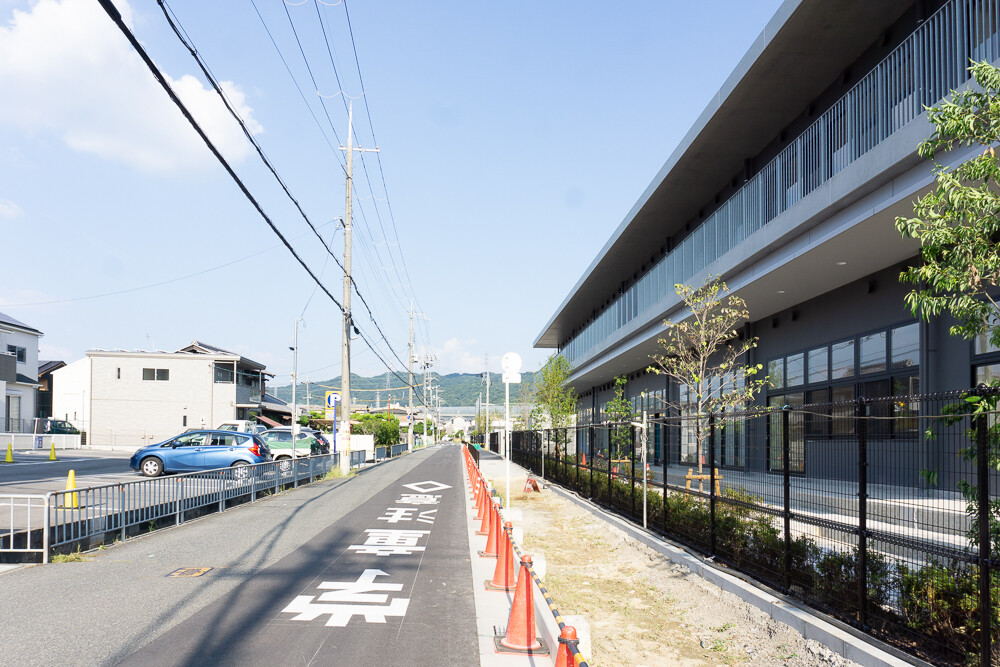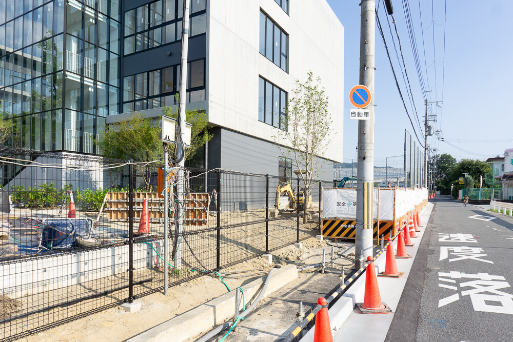 外観もあらわに。「交野みらい学園」の仮囲いが撤去されてる。周囲には歩道もできるみたい
