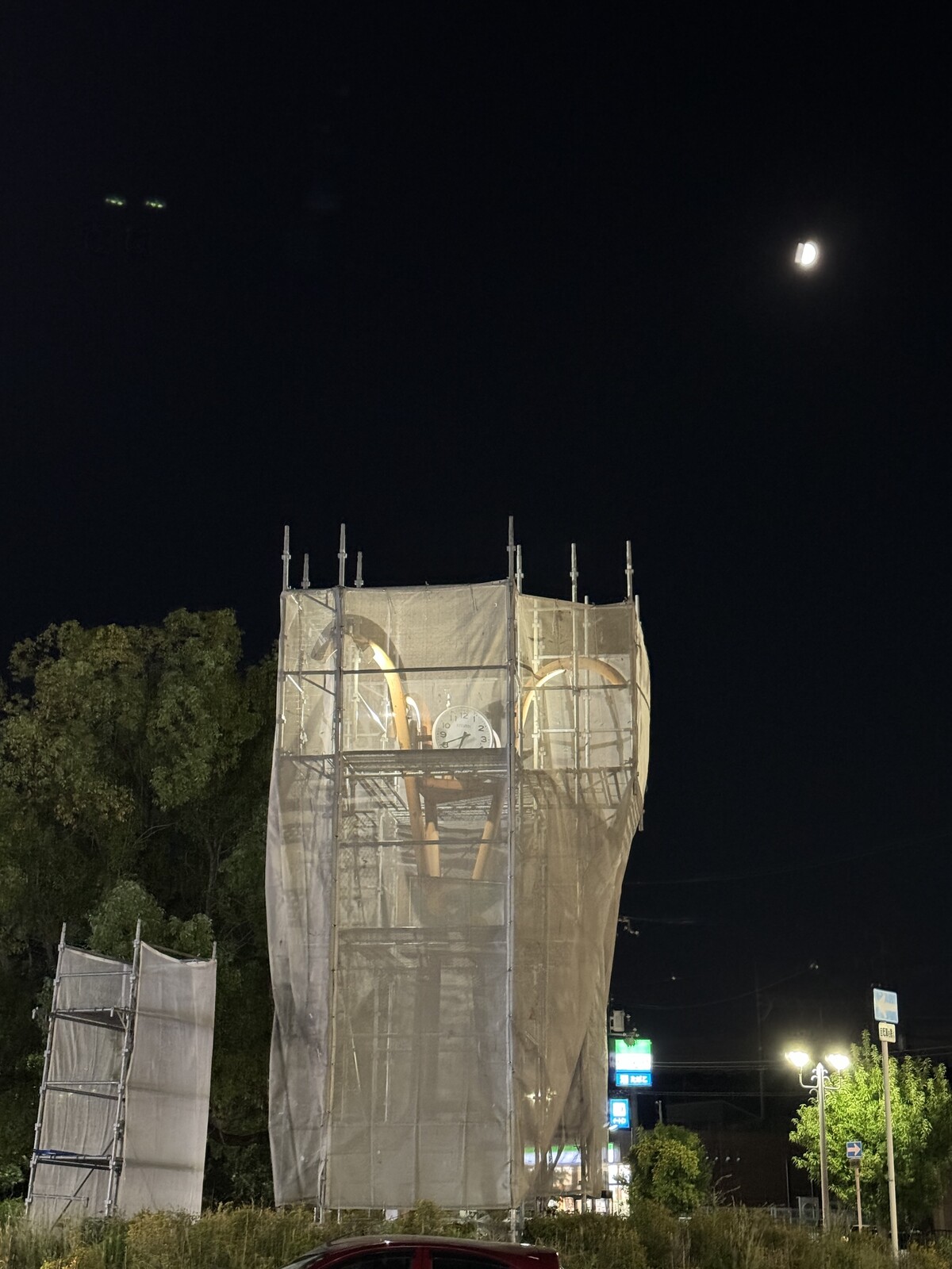 余談ですが、この時計塔、夜見ると電灯の明かりが、工事用ネットに反射してちょっと幻想的なオブジェみたいになってました。