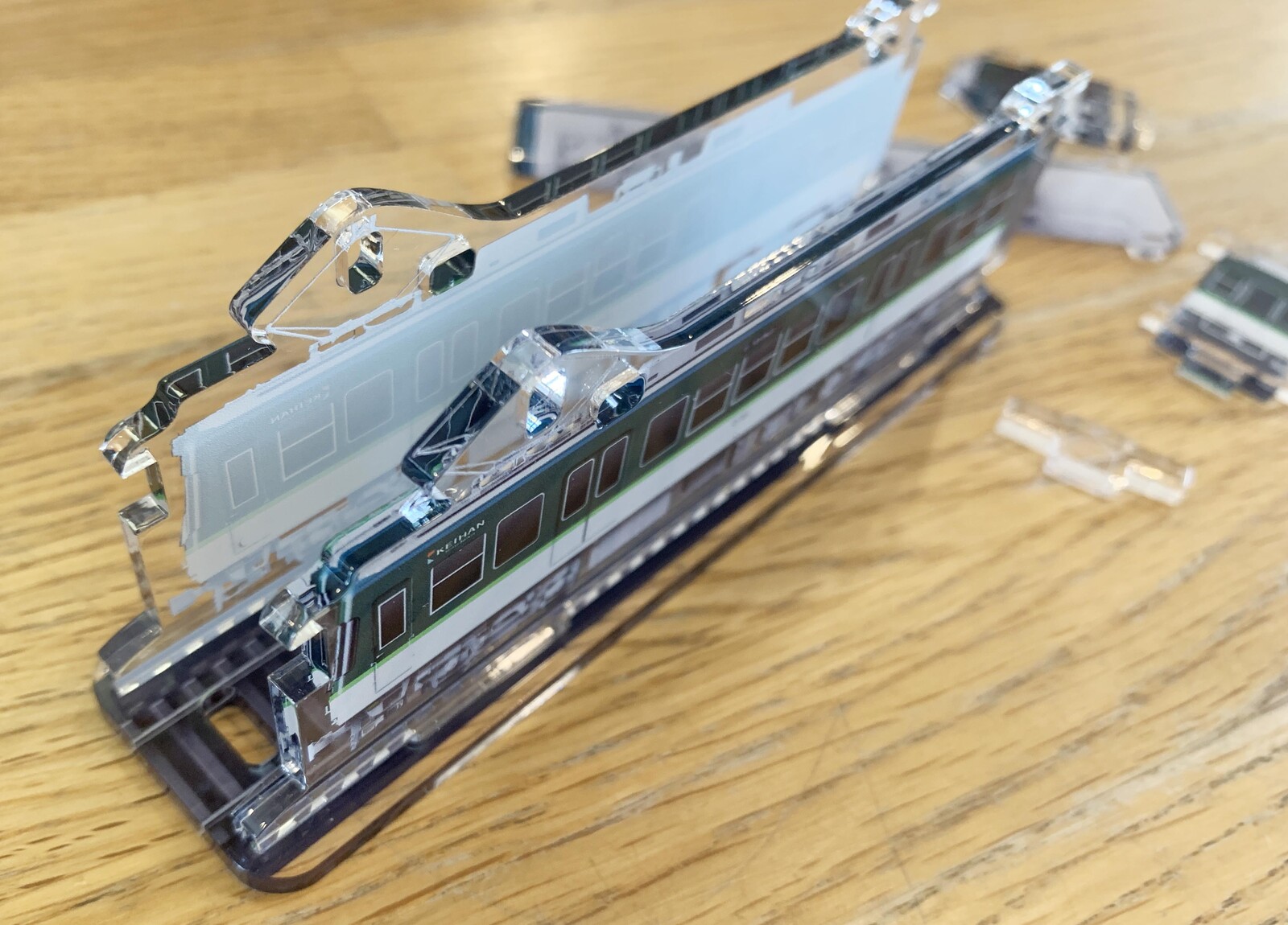 京阪沿線で生まれ育ち、現在は京阪電車の車両清掃に携わる社長が、透明度が高く、ガラスより軽く割れにくい特性をもつアクリルを使い車両を立体で再現できないものか?と考え、この「3Dアクデン」が生まれました。