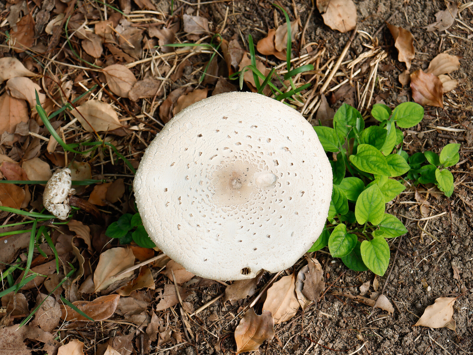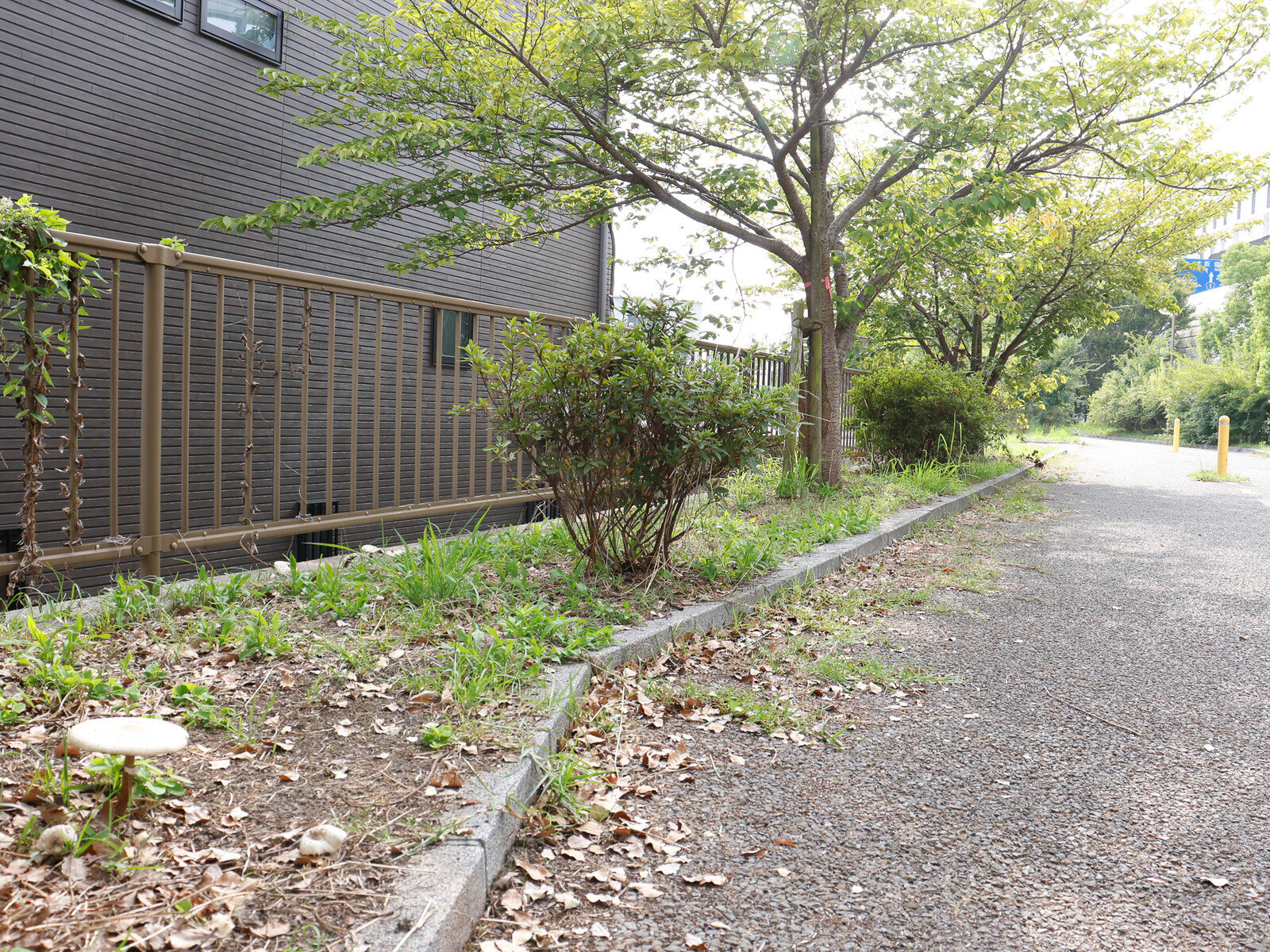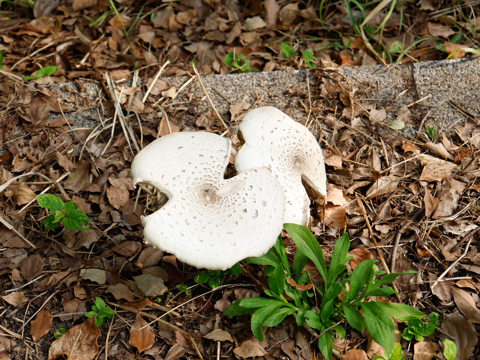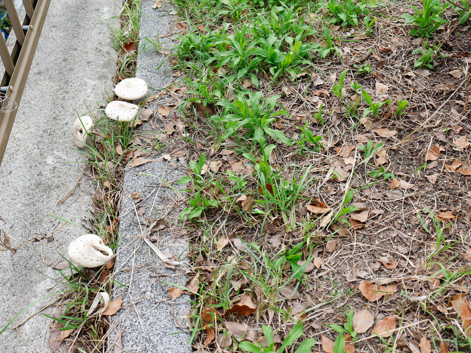 そこの道端に白いキノコが、ポツポツと生えていました。