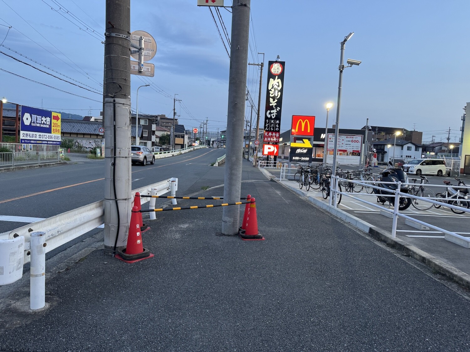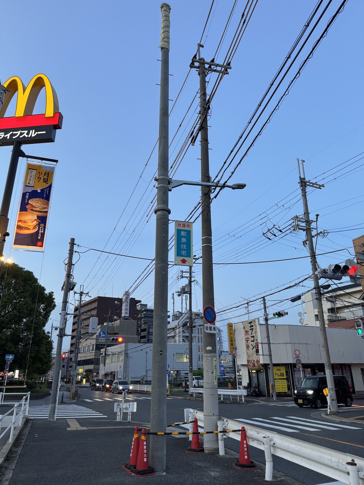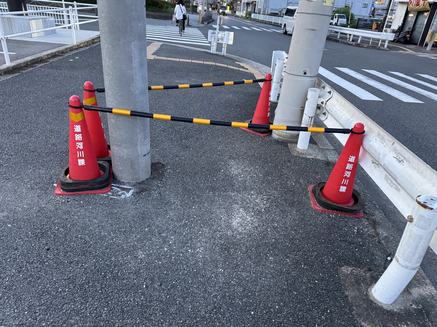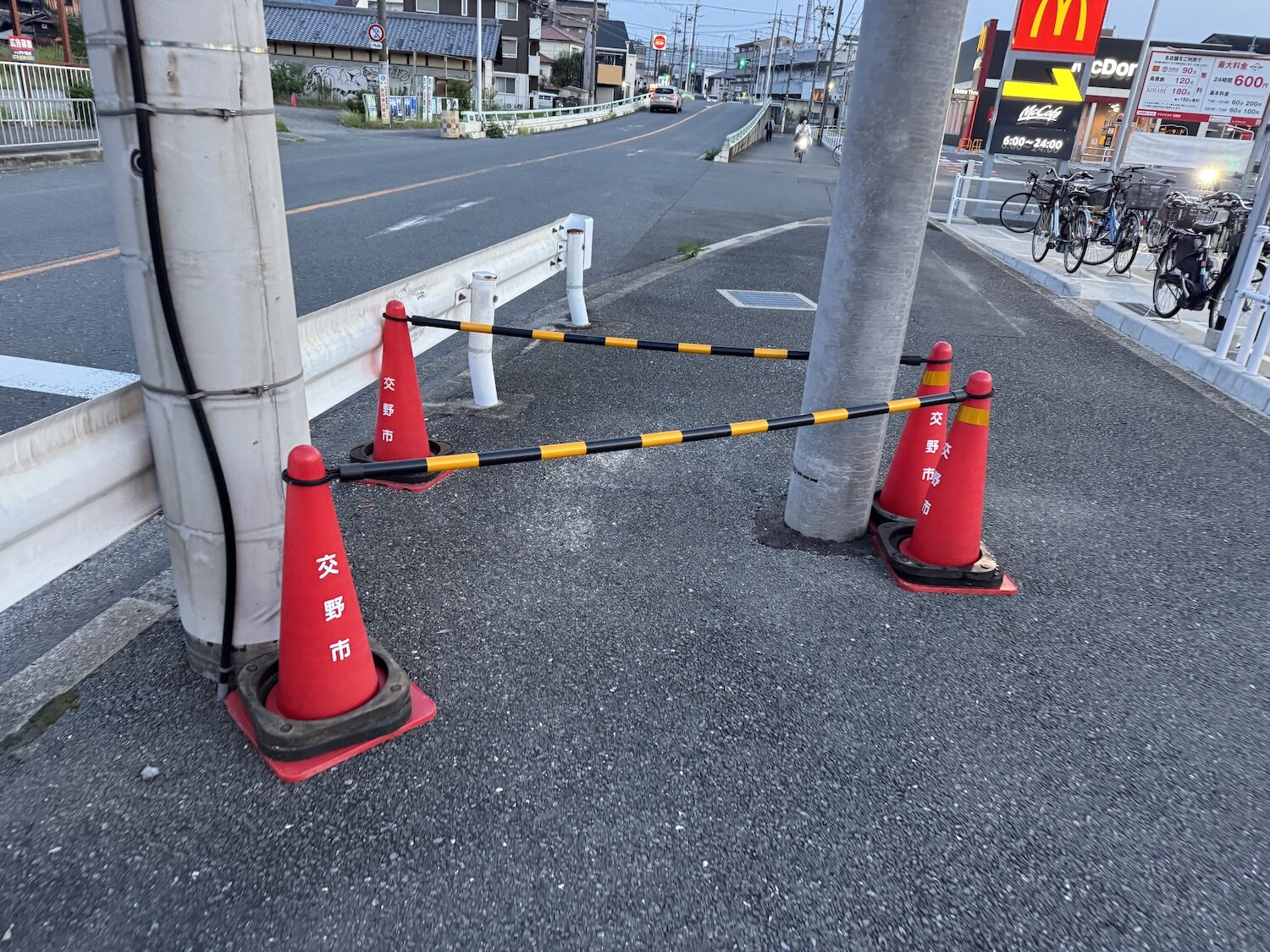 三角コーンが三角ゾーンを構成してる理由とは?マクドナルド交野店前の電柱のところ