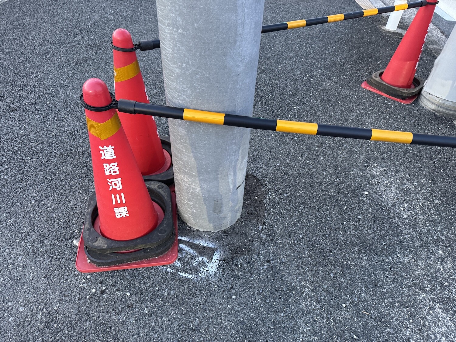 工事の標識もとくに見当たらず、何かしら?と思っていたんですが、よくみると、電柱の根本に白色チョークで記しを確認。
