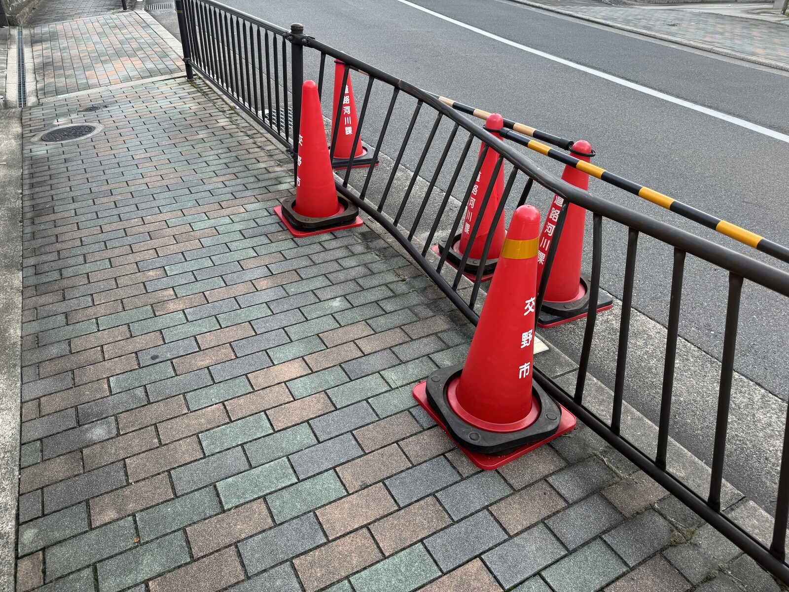 フェンスは交野市の道路河川課の三角コーンが置かれ、注意喚起がされている状況で、しばらくすると修復されると思います。