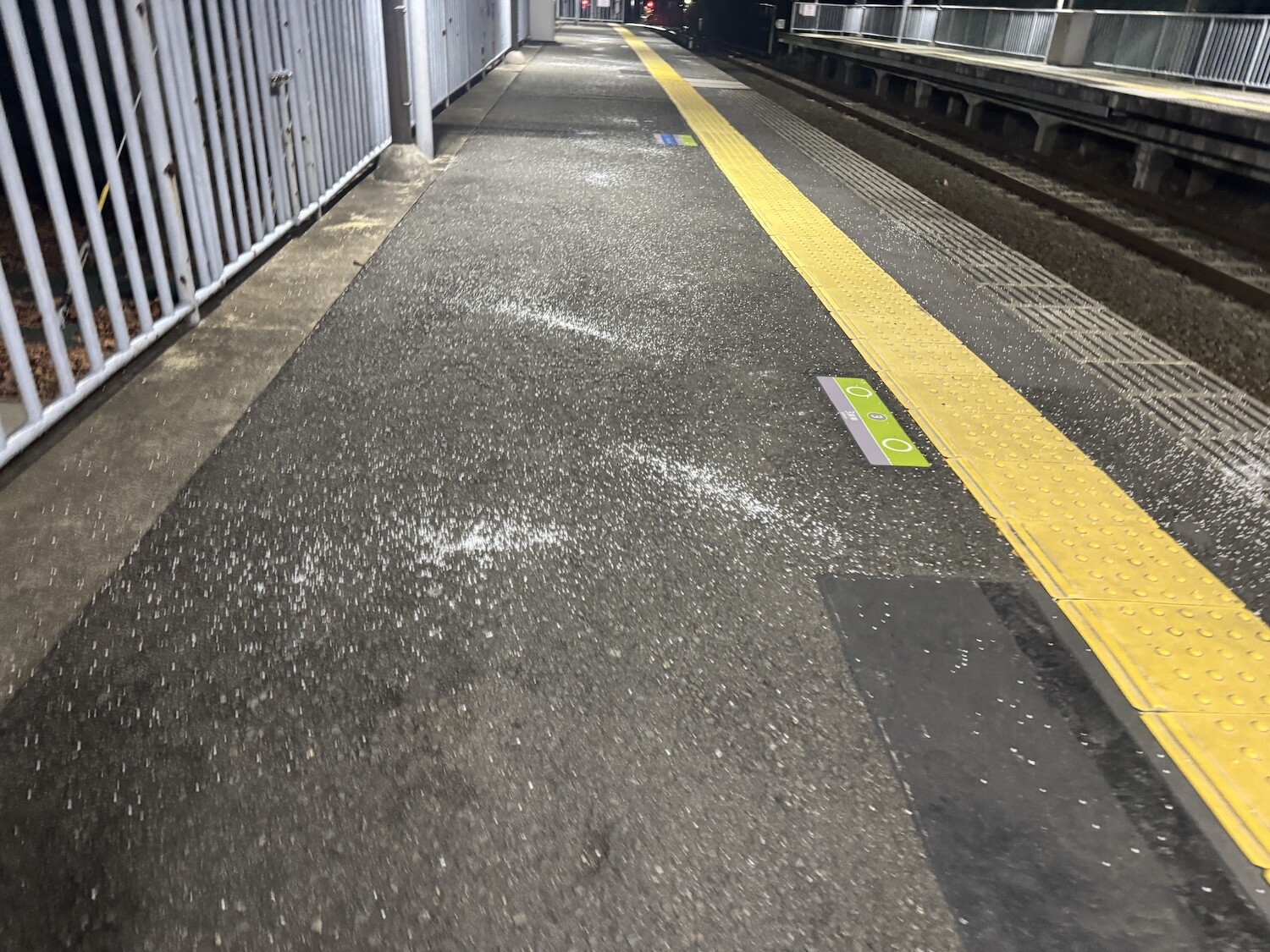 おそらく、ホームで凍結して転倒防止などのため、あらかじめ対策のためにこの粒状のものが駅員さんによって撒かれたのだと思います。