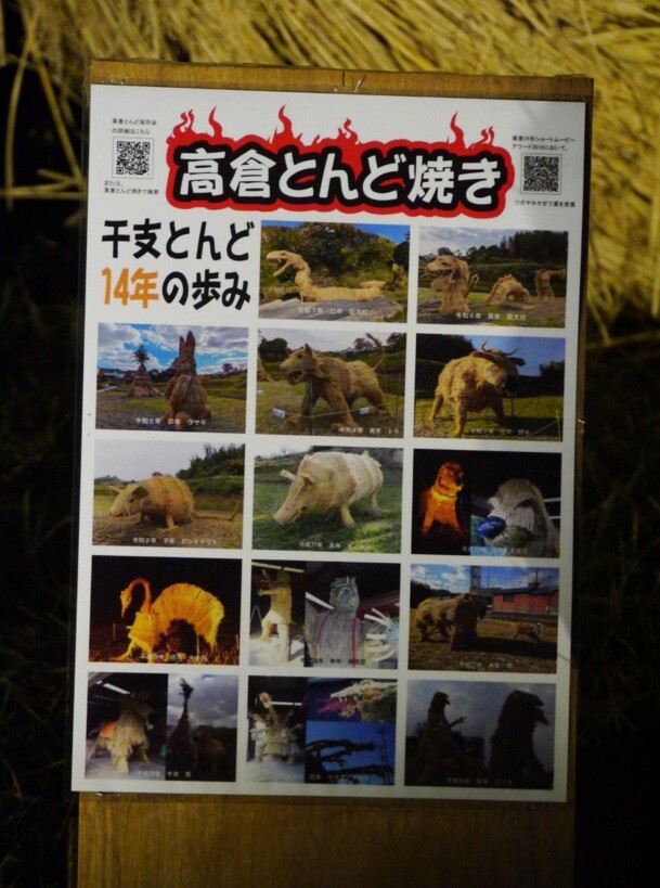 寝屋川市梅が丘の「高倉とんど焼き」は、毎年1月15日にその年の干支をモチーフにした稲わら『干支とんど』を燃やす行事。