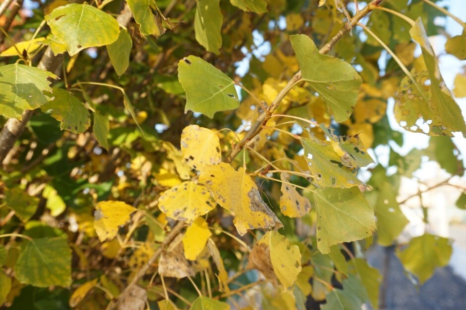 公園の入口付近にある細長い木が黄緑色に。