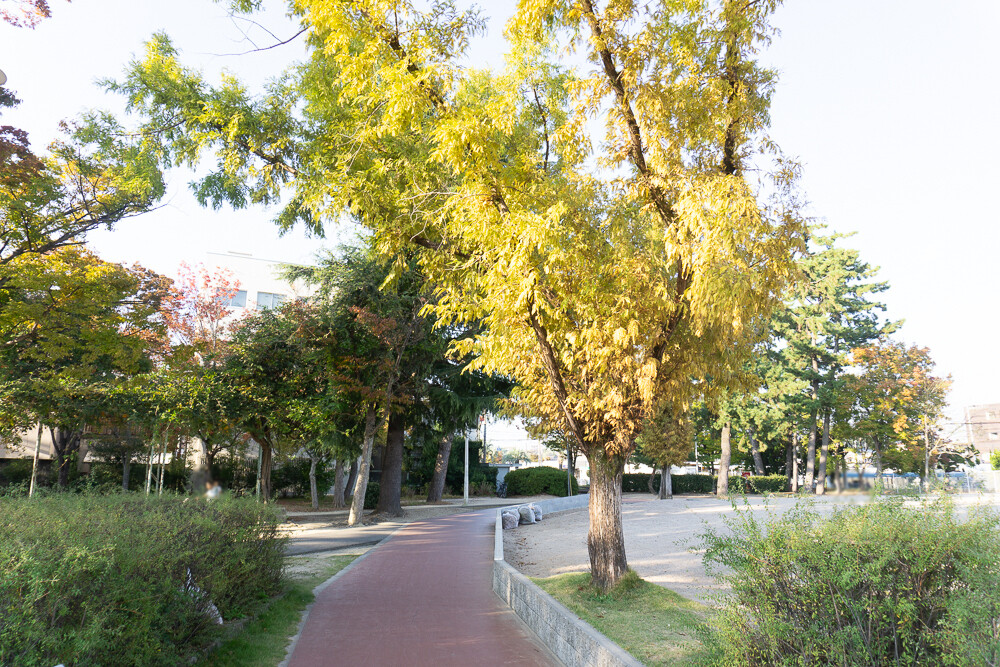 公園の入口付近にある細長い木が黄緑色に。