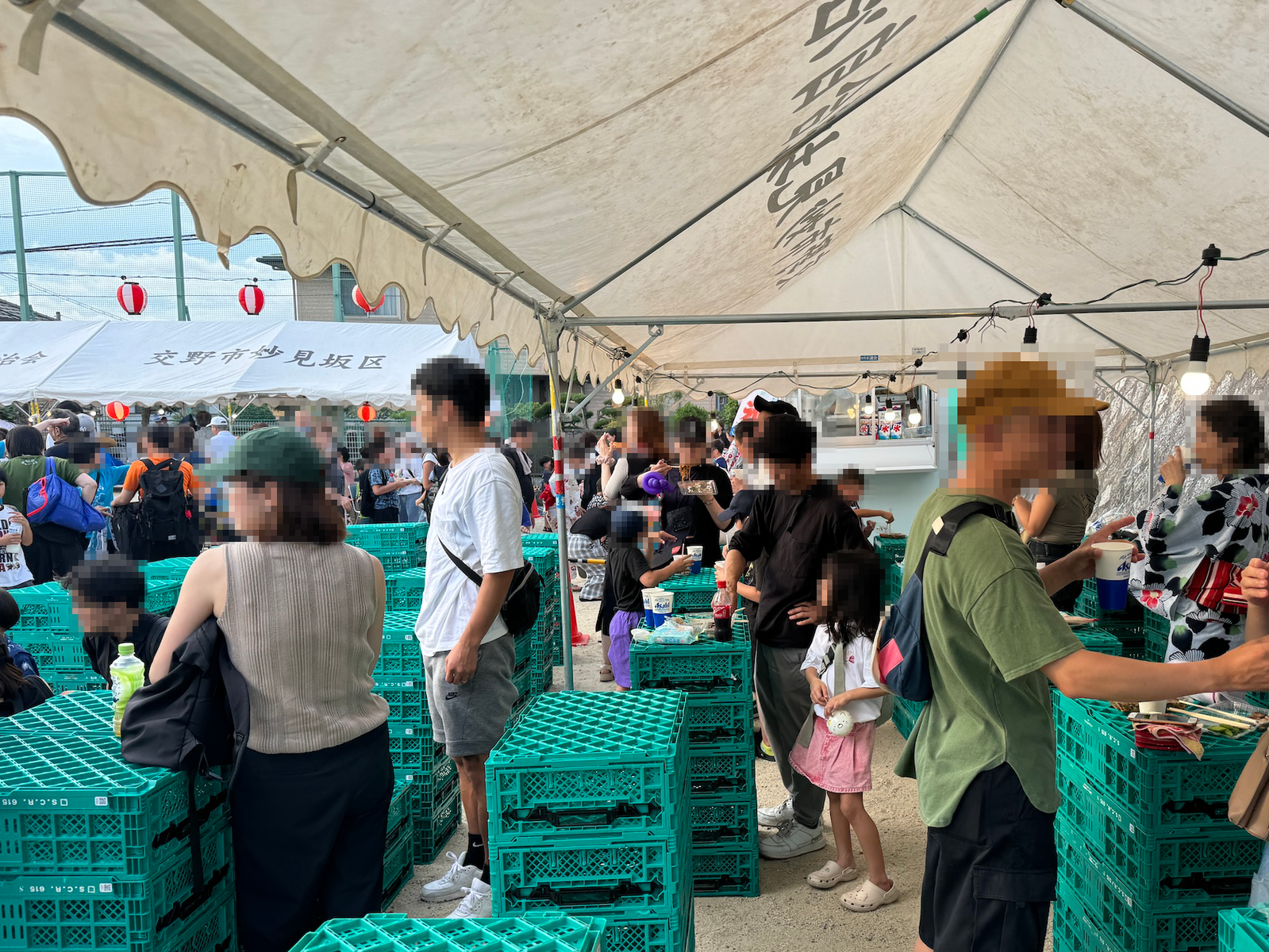 妙見坂の夏まつりといえば、この緑のケースを利用した立ち飲みスタイルではないでしょうか。