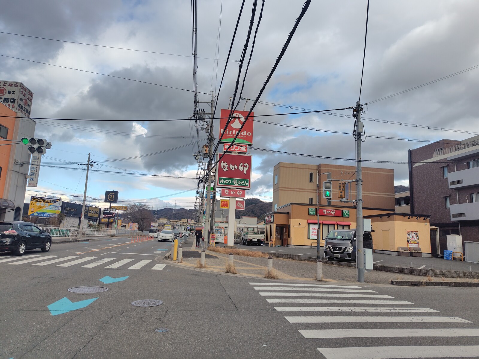 写真左の府道736号線を進むと、交野高校やいきいきランド交野があります。右方向へ行くと、キリン堂や関西スーパーの前を通り、JR河内磐船駅方面へ向かいます。