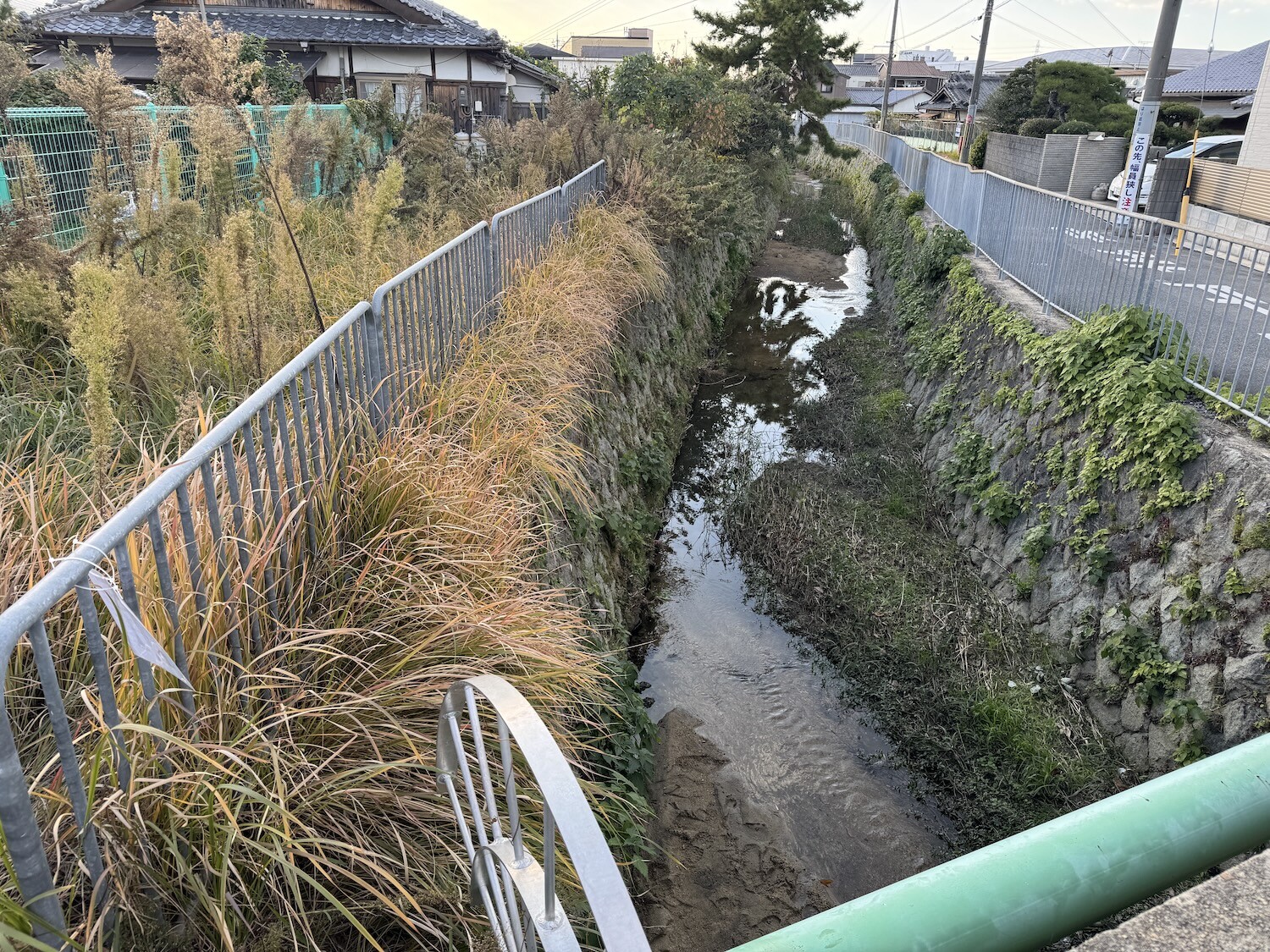 前川のこの橋を渡り左へ進むと旧交野市立第一中学校などがある向井田方面、まっすぐ進むと田畑広がる一本道を通って天野が原町、河内磐船駅方面へつながります。