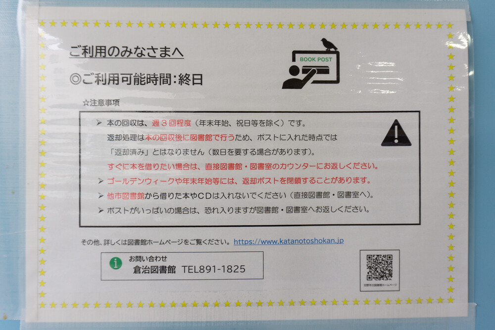 お知らせによると、返却ポストは終日利用可能で、週3回程度(年末年始、祝日などを除く)投入された本が回収されるそうです。