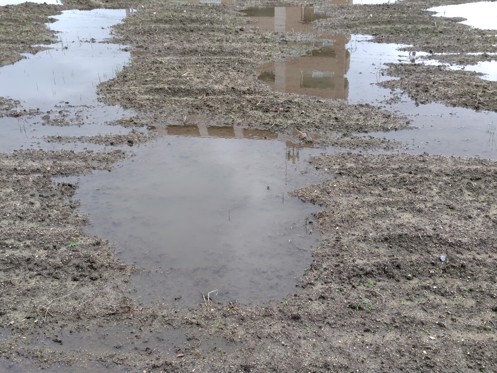 最初は田んぼに水を入れてかき混ぜる「代掻き」が行われた状態なのかと思ったのですが、どうやら田起こしされた田んぼに雨水が溜まっていたようです。