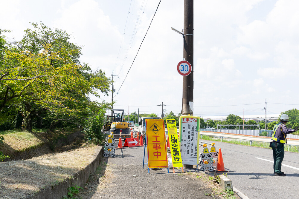 交差点から寺方面に進むと、片側交互通行が実施されています。