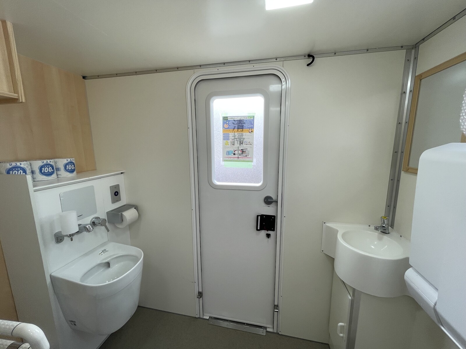 こちらのトイレトラックは、貯水タンクを備えていてトイレは水洗式で稼働し、ソーラーパネルも備えているため、停電時も照明や換気扇などが使用できるのが特徴です。