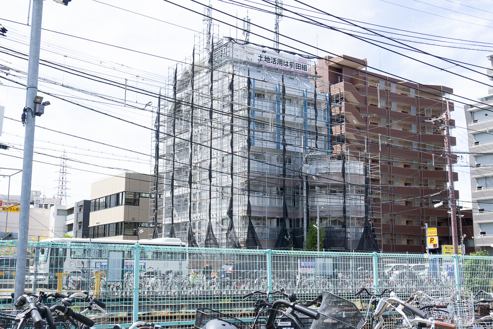 駅前のマンションも台風に備えてか、足場のシートがたたまれた状態に。