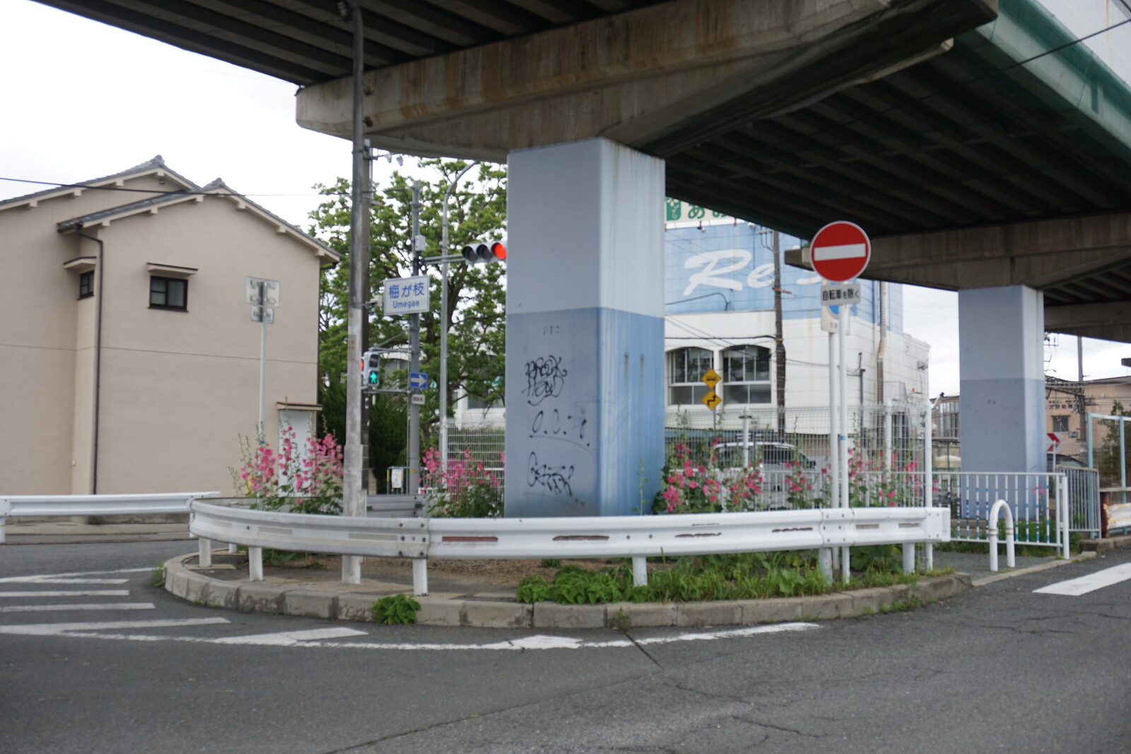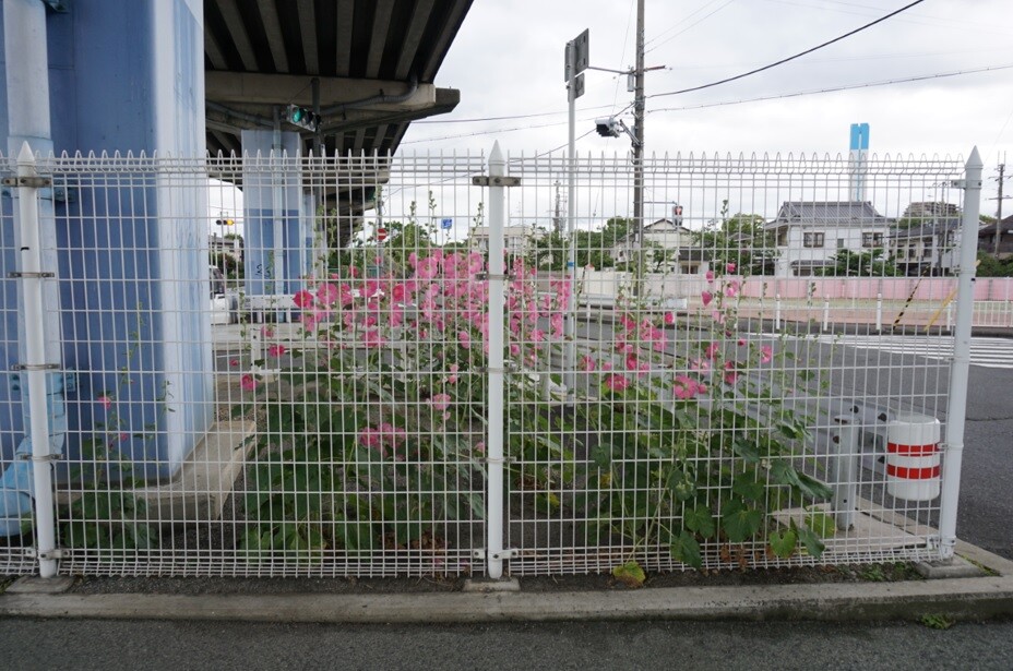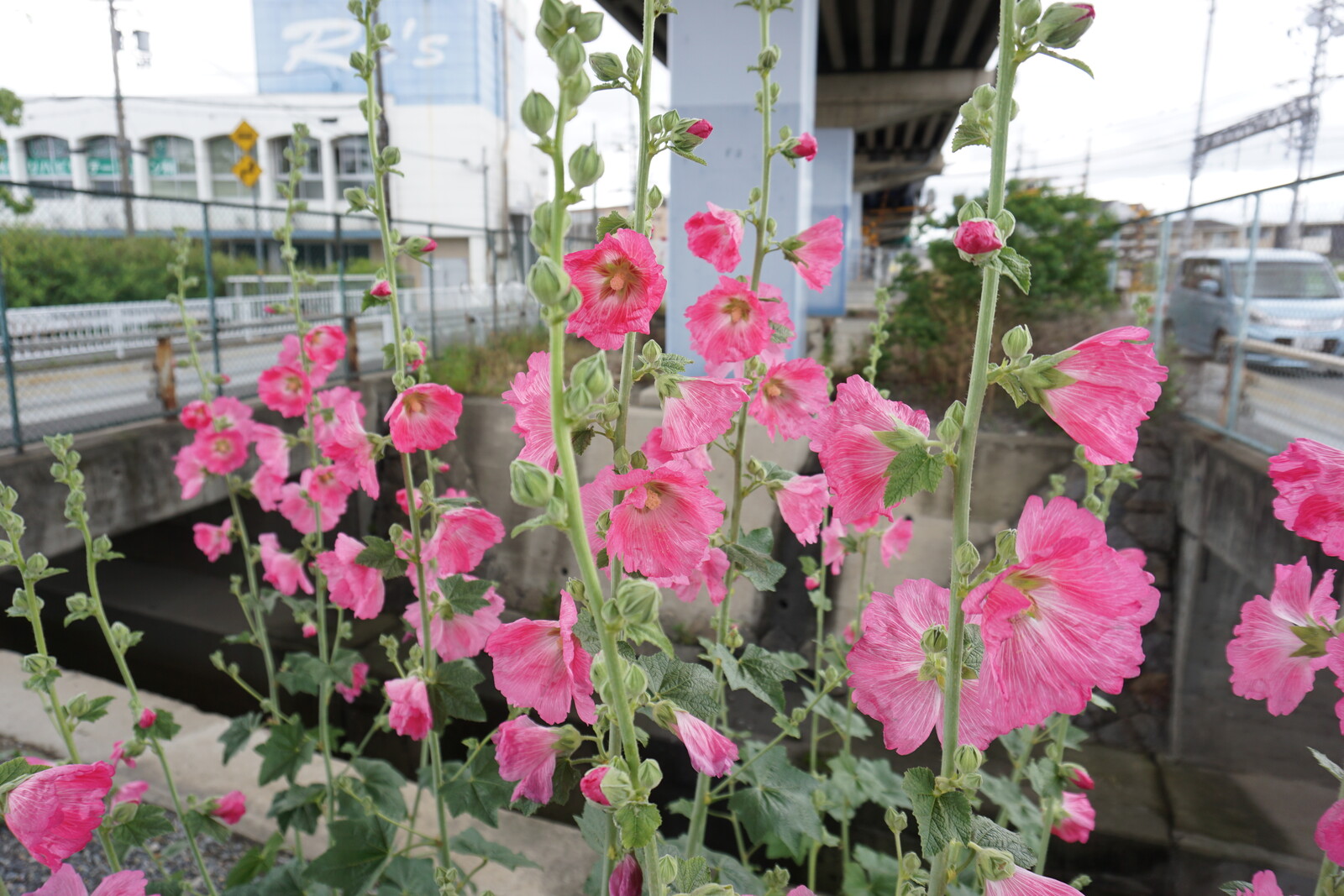 高架下の梅が枝交差点にタチアオイの花が咲いています。