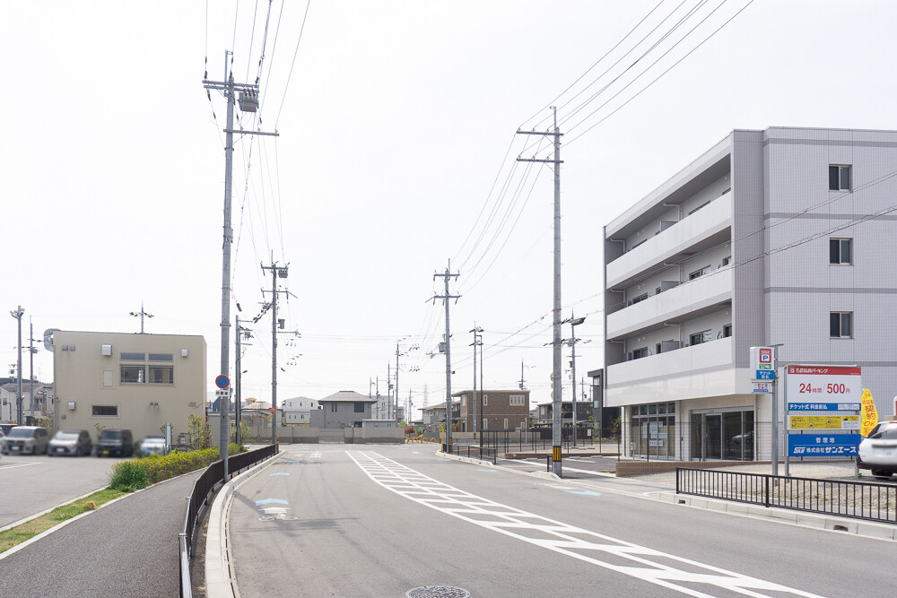 写真左が完成した4階建てのマンション、右手がトナリエ星田。