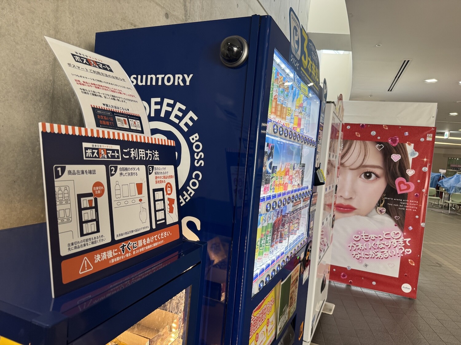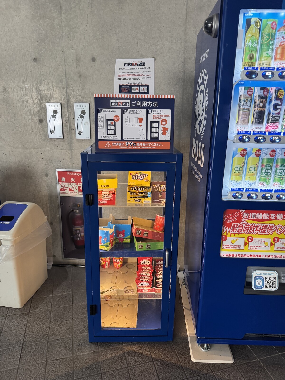 隣が缶コーヒーで有名なサントリーのBOSSの自動販売機、ボスマートのロゴにも缶コーヒーのBOSSのおじさんがいることからも関連があるお菓子の販売コーナーで、説明書きをみると隣の自動販売機にお金を入れてボタンを押すと扉のロックが解除されて商品を取り出すことができる仕組みだそうです。