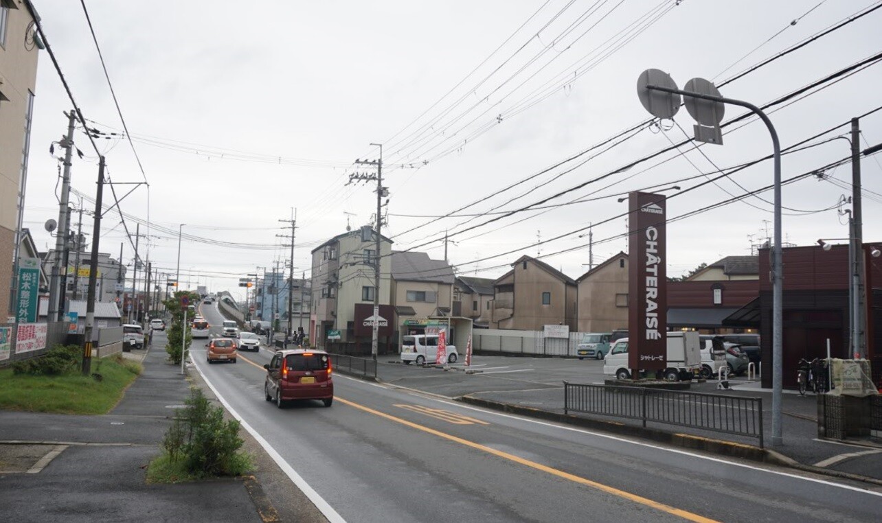 寝屋川市方面を向くと、郡津交差点の先に京阪交野線を越える高架橋が見えています。