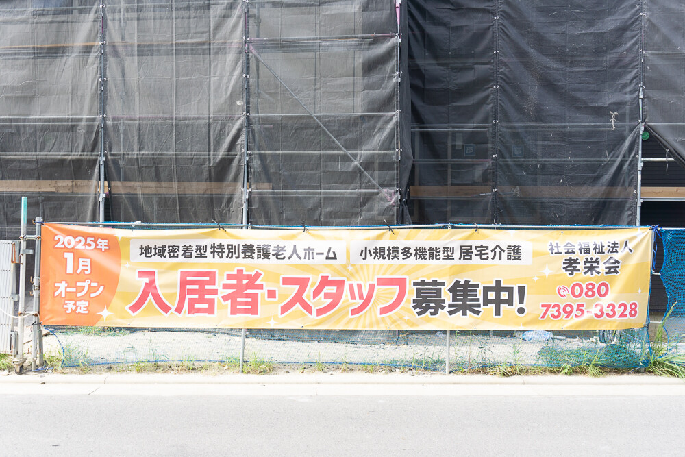 現地のお知らせによると、この介護施設は「社会福祉法人孝栄会」の特別養護老人ホームで、小規模多機能型居宅介護も行うみたい。
