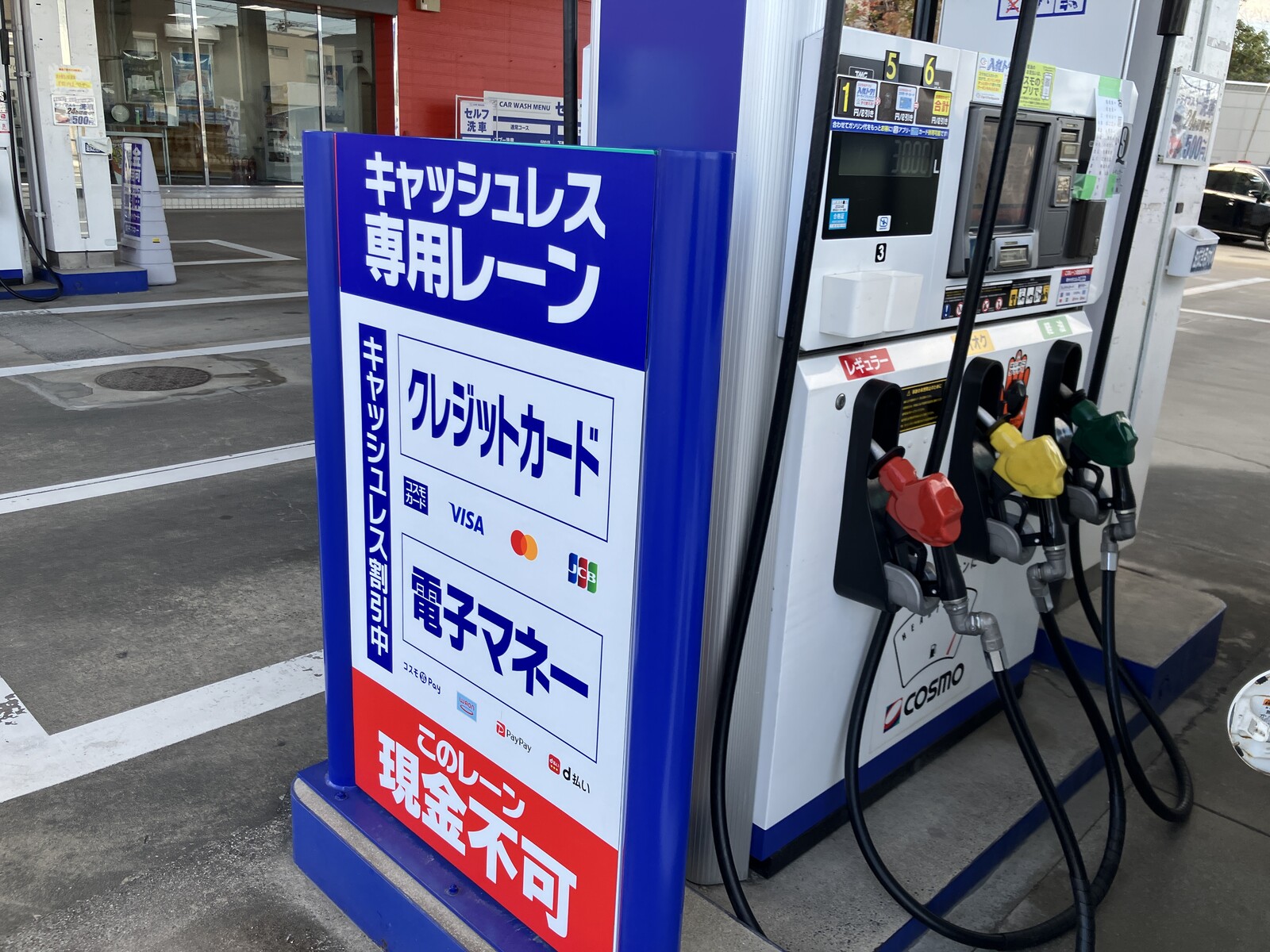 スーパーマーケットのセルフレジにもキャッシュレス専用レーンがあるのが当たり前になりましたが、とうとう、ガソリンスタンドにもキャッシュレスレーンができていました!