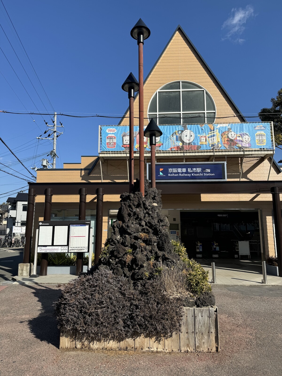 正解は京阪電車私市駅の改札前にあるなんかゴツゴツしたオブジェっぽいものとともにある電灯でした。