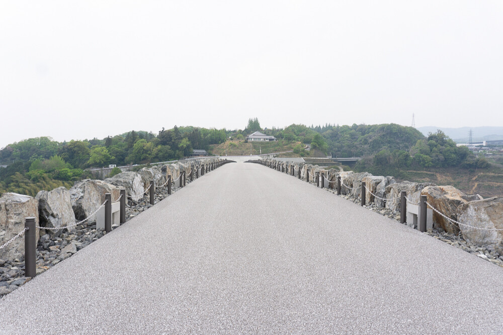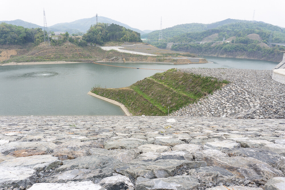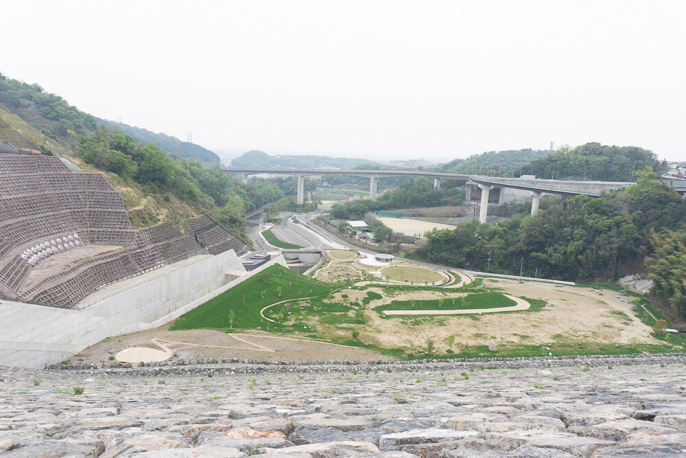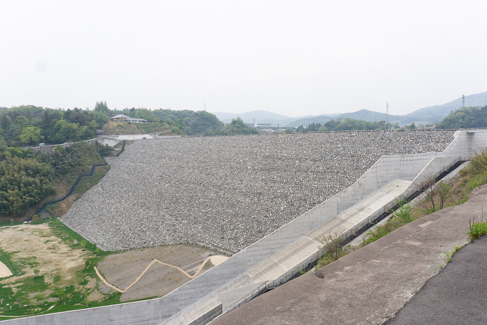 安威川ダムは岩石や土砂を積み上げたロックフィルダムで、表面がゴツゴツです。