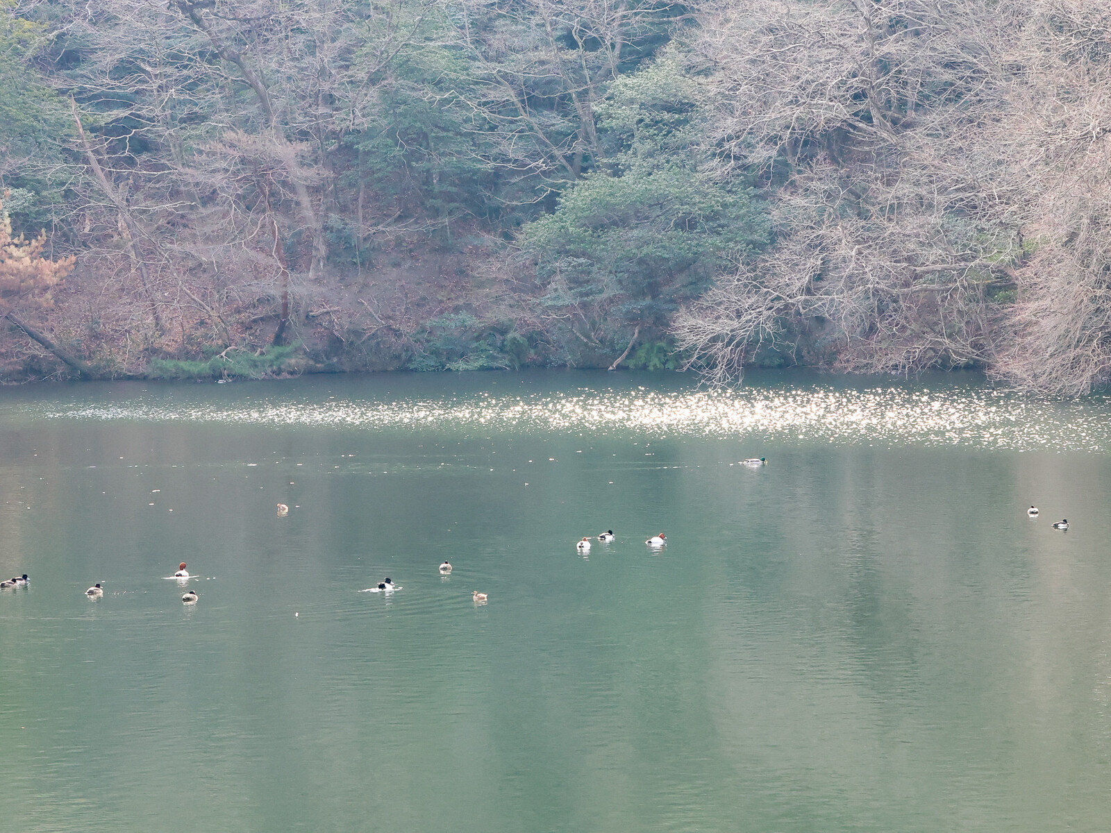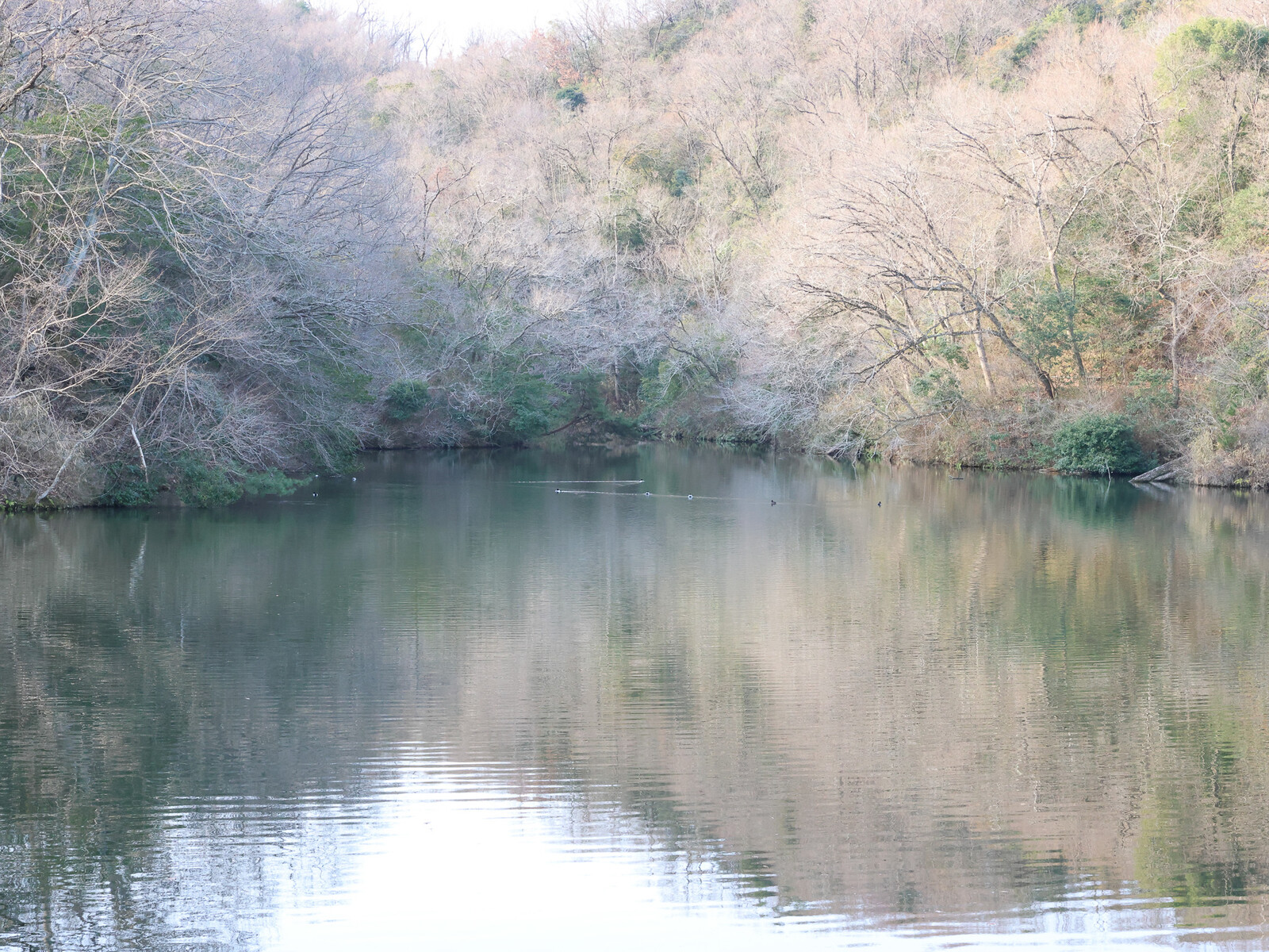 池水面には、野鳥が静かに泳いでいました。
