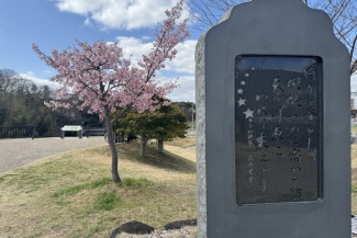 河津桜が1本凛として綺麗に咲いてる。藤原業平のでっかい七夕石碑のところ