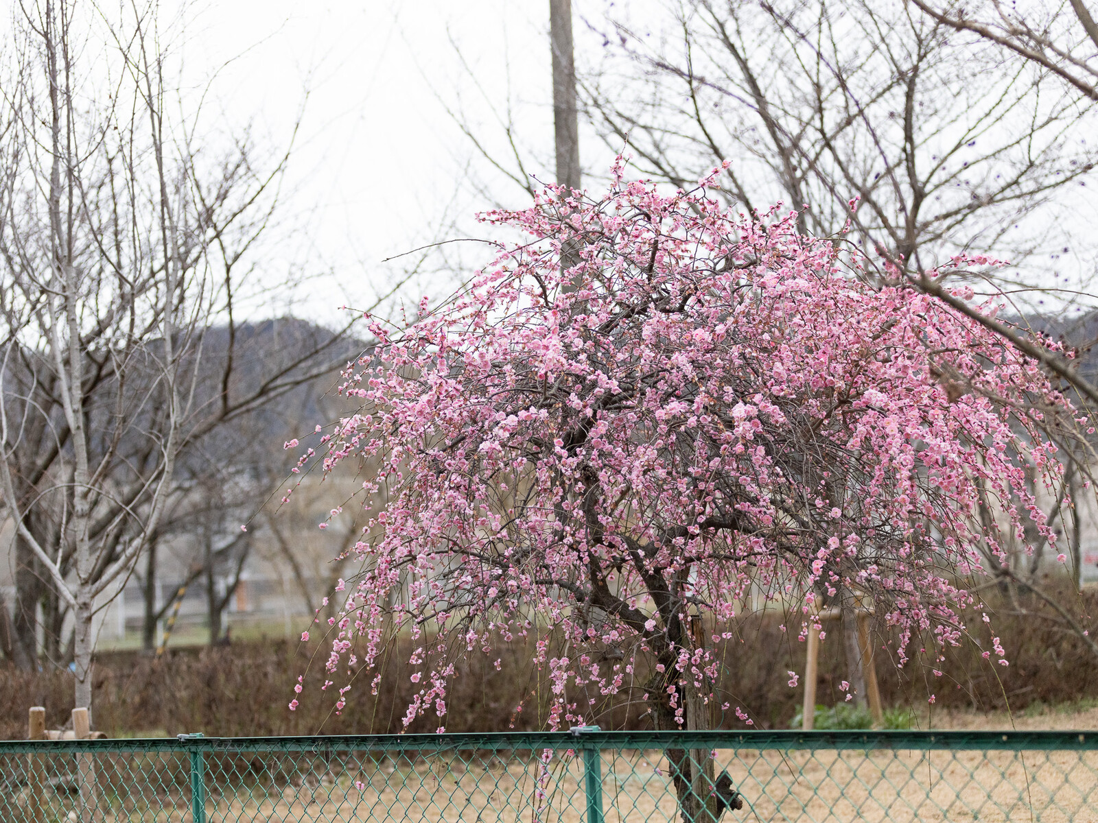 天の川の河川敷のところで枝垂れ梅が見事に咲いている!