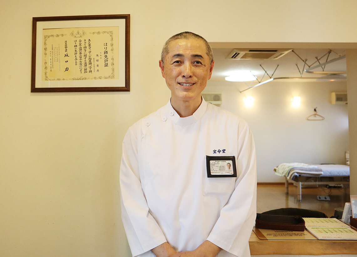 私は、目が全く見えない視覚障害者の蔦田貴彦と申します。交野市で鍼治療院『宝命堂』を開業しています。