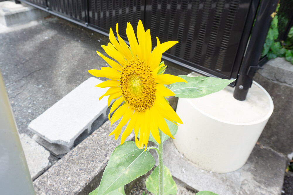 よく見ると向日葵の花は、駐車場の奥のほうや掲示板の下にも咲いています。