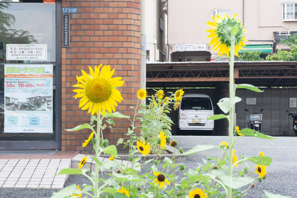 そのJA北河内磐船支店の駐車場のところに向日葵の花が咲いています。