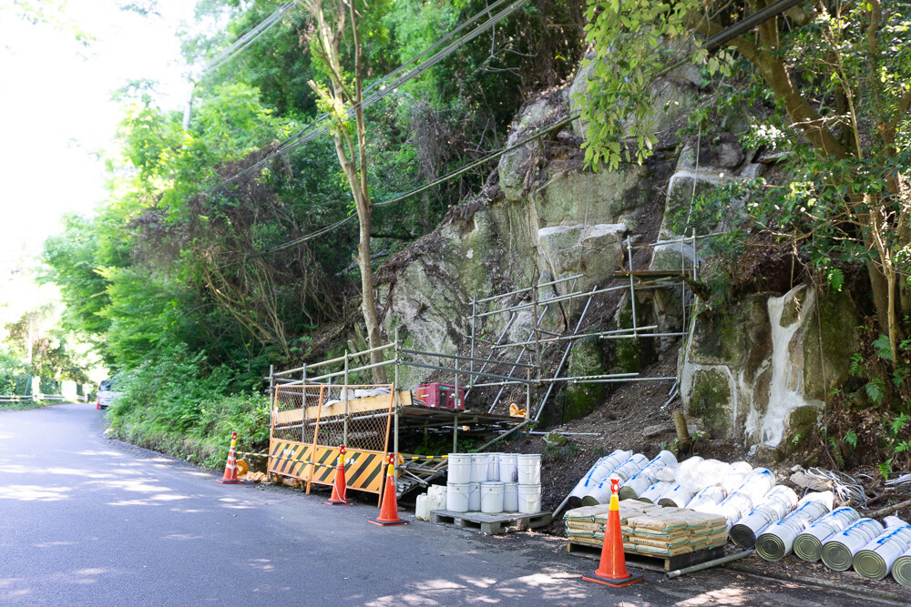 その道路沿いの崖で工事が行われています。