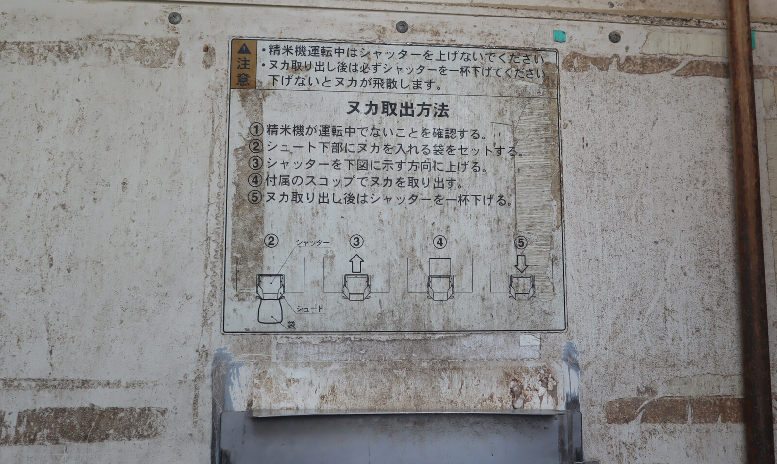 精米機が運転しているときに、シャッターをあけてはいけないなどの注意書きなどがありました。