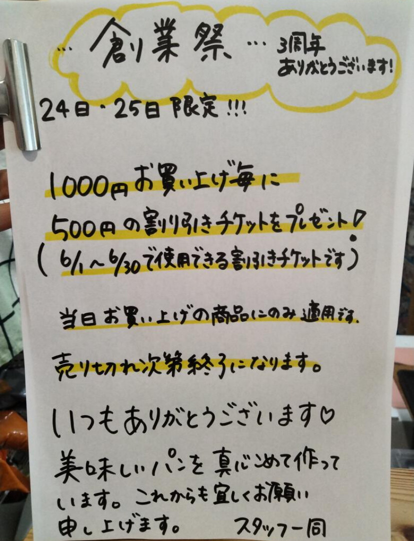 私部の『カジパン工房』さんが創業3周年。24日と25日限定で創業祭を開催。お得なお買い物チケットも。