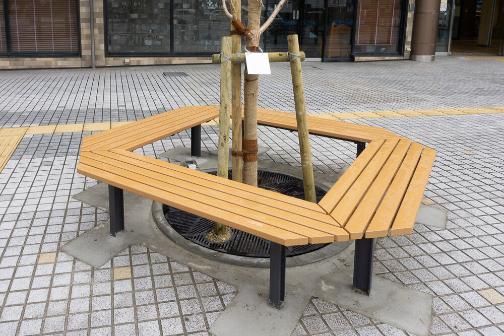 猛暑対策として駅前に植樹とベンチが設置されています。