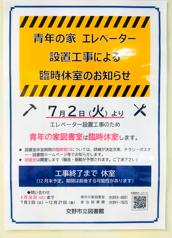 「青年の家」が7月から図書室などを休室するみたい。エレベーター設置工事のため