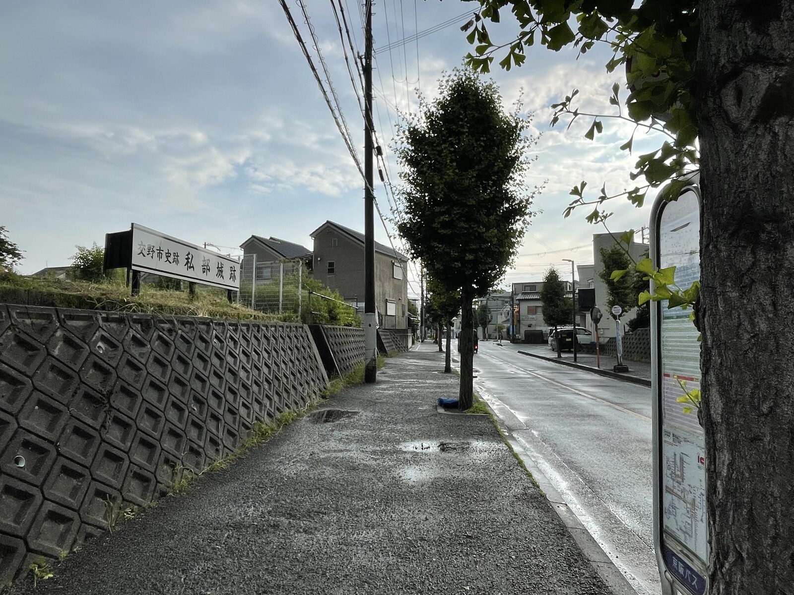 私部城跡の前のバス停は「交野郵便局」。目の前に交野市指定史跡がある。
