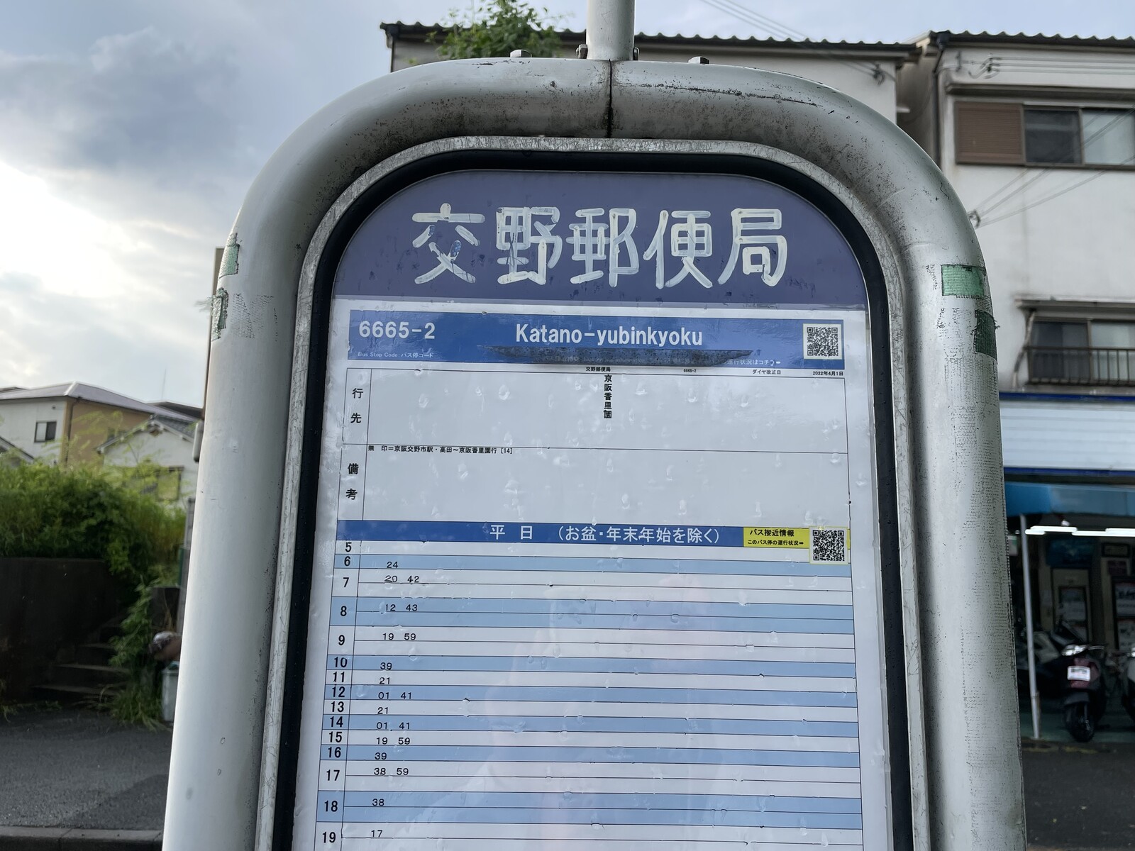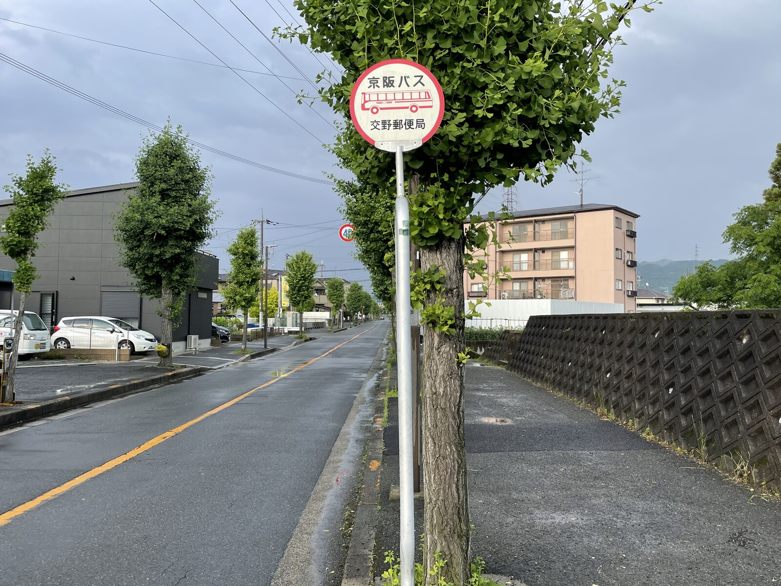 一方交野郵便局はこのバス停より徒歩2分ほどの場所になります。