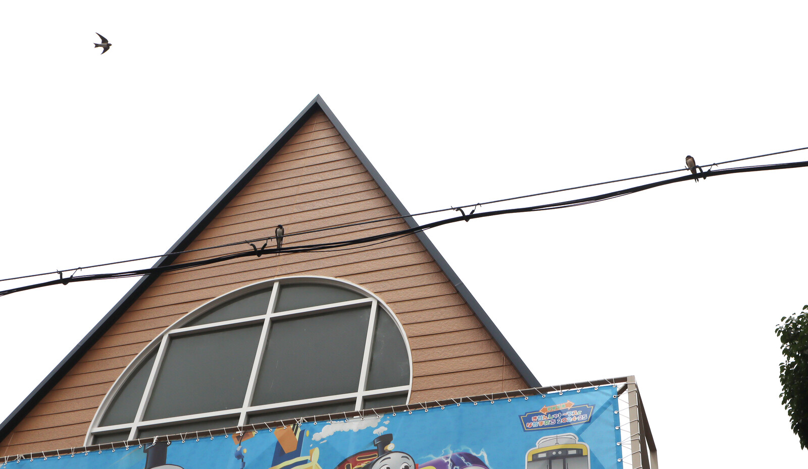 私市駅の駅舎周辺では、親鳥がたくさん旋回しては、電線にとまったりしていました。