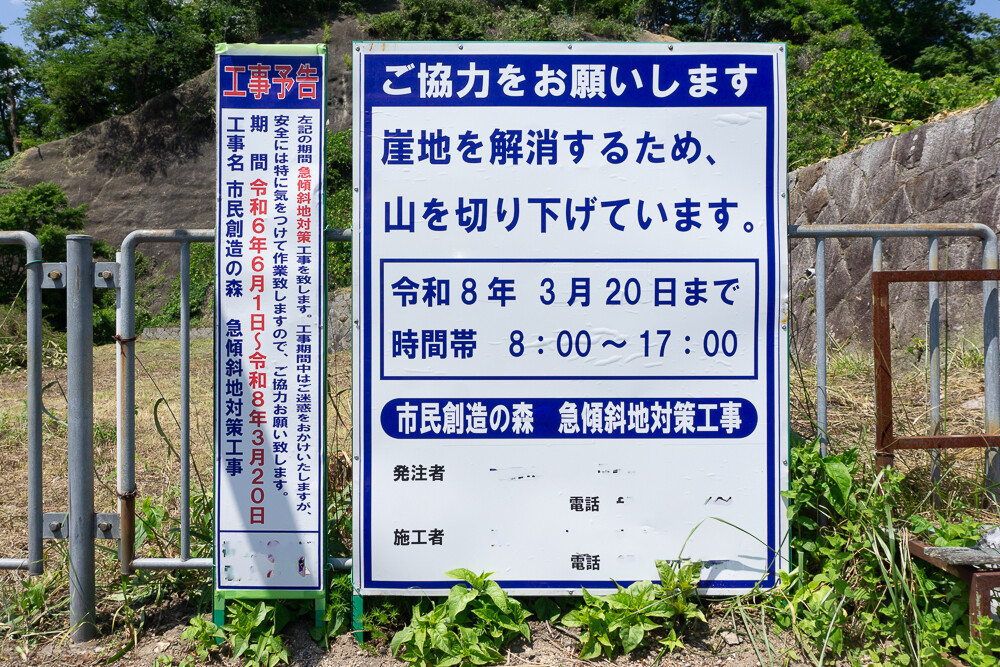 お知らせによると、工事は急傾斜地対策として崖地を解消するもの。