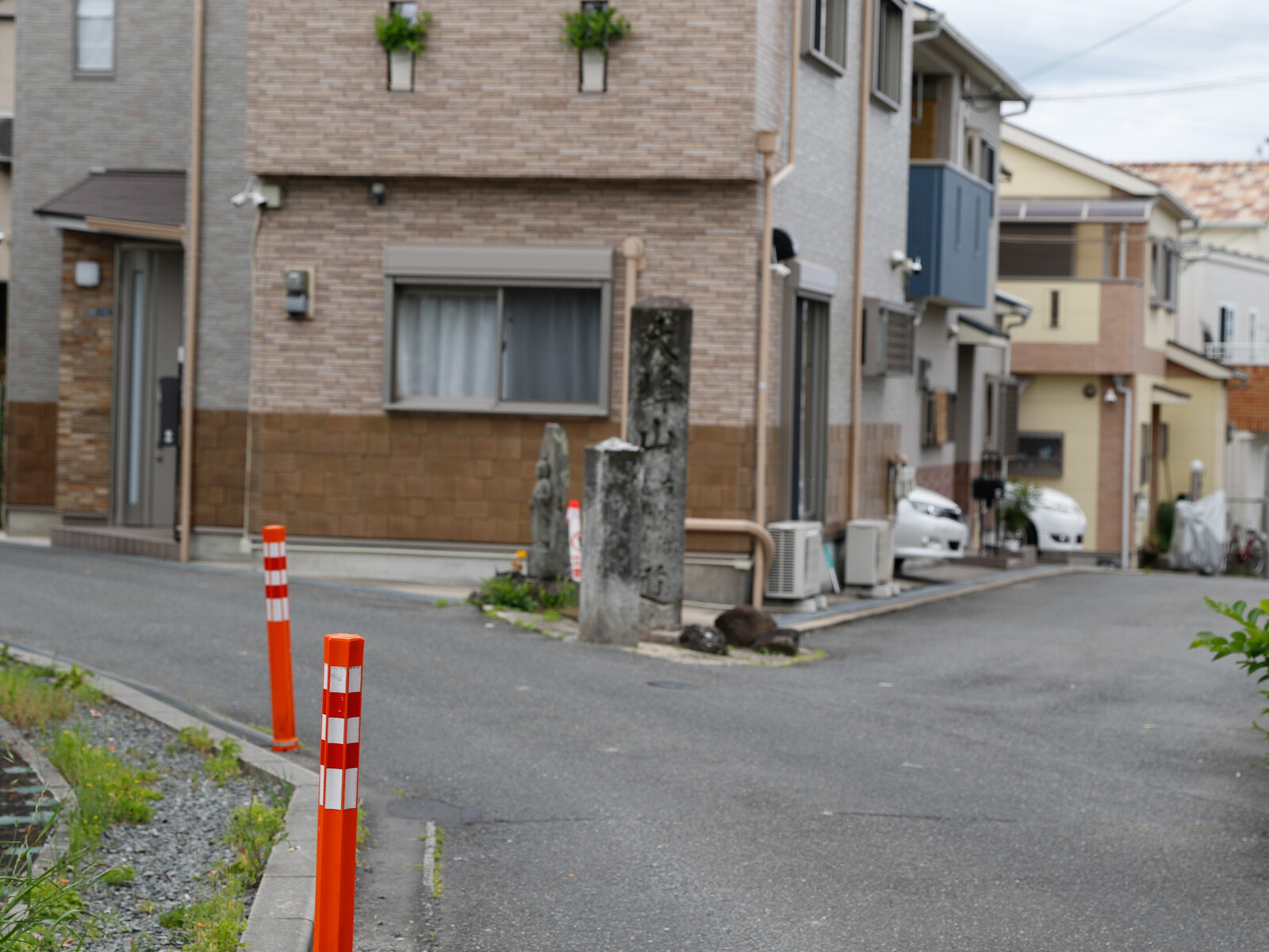 星のまち交野上ノ山遺跡周辺・釈尊寺界隈探訪によると手前の小さな石標には「右 山根街道 左 すぐ 東高野道」と掘ってあるとなっていますが、残念ながらはっきりは見えませんでした。