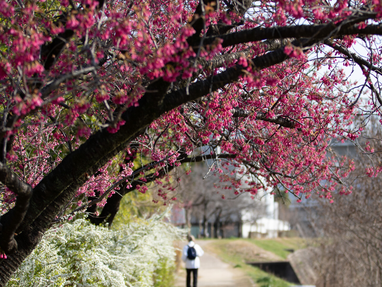 逢合橋近くに咲いているこちらの濃いピンクのお花は、桜の種類ではないのかもと思いましたが、枝の様子や幹の皮目がどう見ても桜。