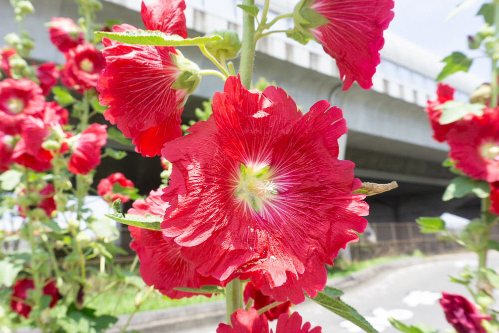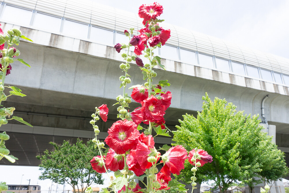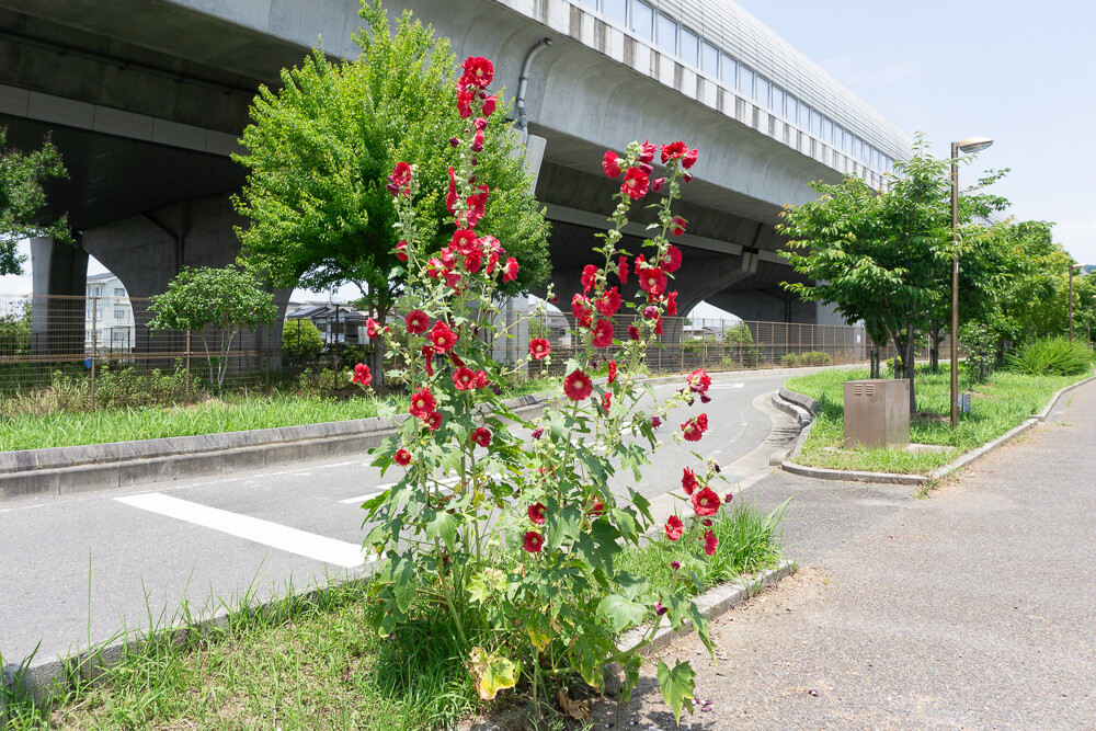 背の高い真っ赤な花。向井田の第二京阪道路にタチアオイが咲いてる